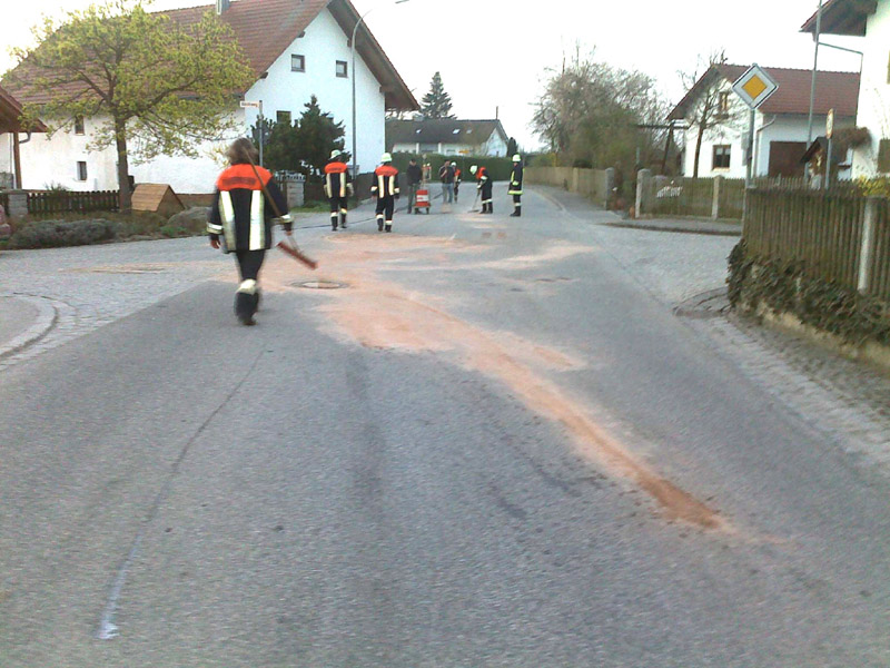 15.06.2009, 13:15 - 15:00 Uhr Ein geplatzter Hydraulikschlauch eines Baggers verursachte eine Ölspur von der Tankstelle durch das ganze Dorf bis zur Schule. Die FFW Kirchroth sicherte den Verkehr.