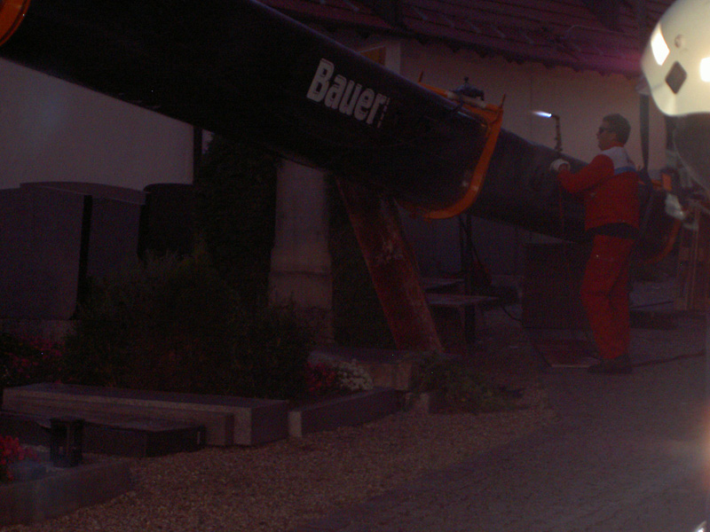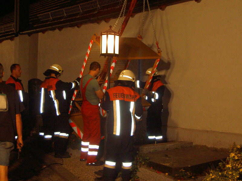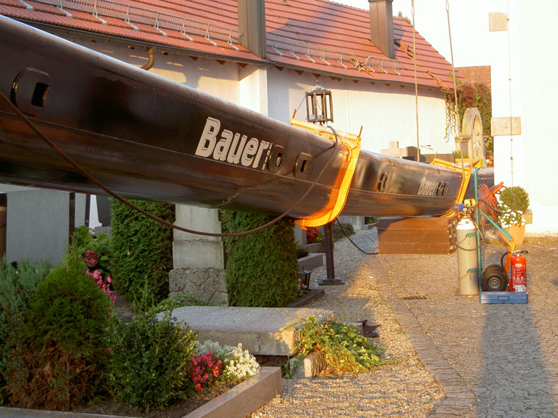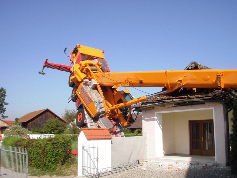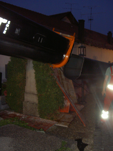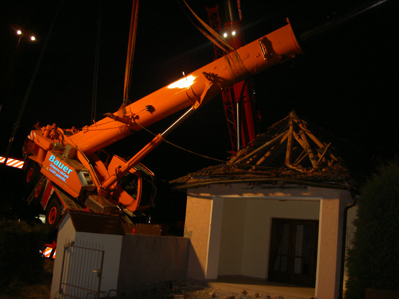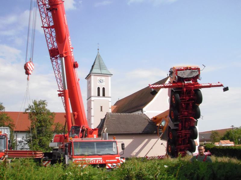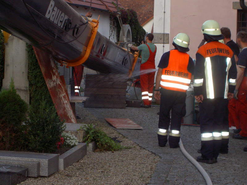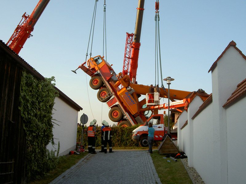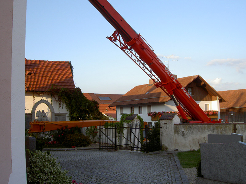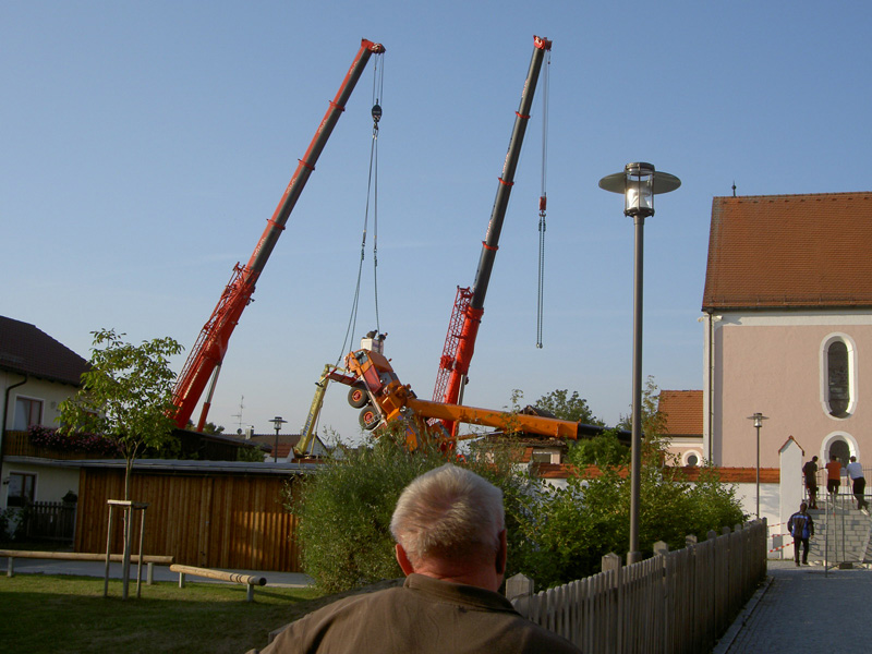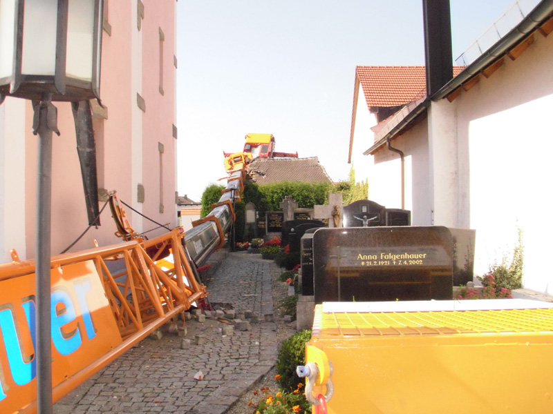 10.09.2009, 10:59 - 23:30 Uhr Umgestürzter Kran im Friedhof Am Donnerstag Vormittag ist aus bisher ungeklärten Umständen ein Autokran in Kirchroth umgekippt. Der Kran stand in einer Wiese und sollte mit einem Arbeitskorb Handwerker zum Kirchturm heben, die am Dach Reparaturen vornehmen wollten. Beim Probelauf ist es dann passiert, der Kran hat zu kippen begonnen und ist zuerst am Kirchturm aufgeschlagen und daraufhin hat er den Dachstuhl des Leichenhauses zerstört. Des weiteren wurden mehrere Gräber, ein Fußweg, die Friedhofsmauer und ein angrenzendes Dach beschädigt. Glücklicherweise wurde bei dem Unfall niemand verletzt. Zur Bergung wurden weitere drei Kräne gerufen, bevor der Ausleger des gekippten Krans von der Herstellerfirma mit einem Brennschneider zerteilt wurde. Bis der endgültig geborgen war musste die Ortsdurchfahrt von Kirchroth bis spät in die Nacht komplett gesperrt werden. Zum Ausleuchten der Einsatzstelle wurde die Feuerwehr aus Bogen mit einem Lichtmast hinzugezogen.