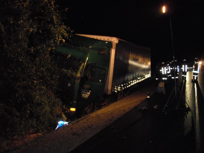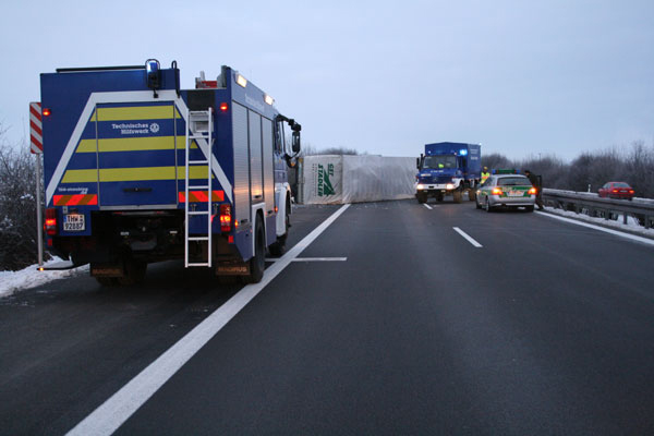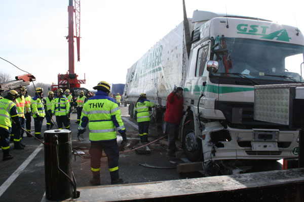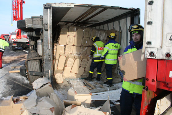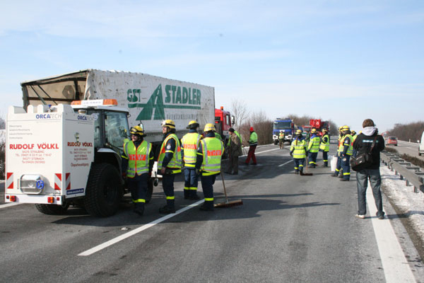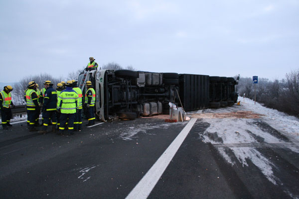 19.02.2009, 06:35 - 07:15 Uhr LKW-Unfall auf der Autobahn Am Donnerstagmorgen hat ein 27 jähriger LKW-Fahrer die Kontrolle über sein Fahrzeug verloren. Daraufhin kippte der Lastwagen um und blieb quer über die gesamte Fahrbahn auf der Seite liegen. Die Feuerwehr Kirchroth wurde zu dem Unfall alarmiert, weil sich der unverletzte Fahrer nicht selbstständig aus dem Führerhaus befreien konnte. Er wurde mit Steckleitern aus seiner misslichen Situation befreit. Parallel dazu wurde begonnen, auslaufenden Diesel abzubinden. Im Anschluss wurde die Unfallstelle an das THW Straubing übergeben.