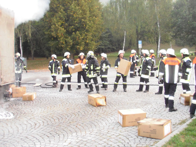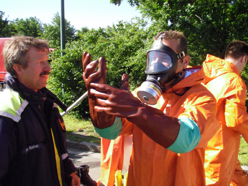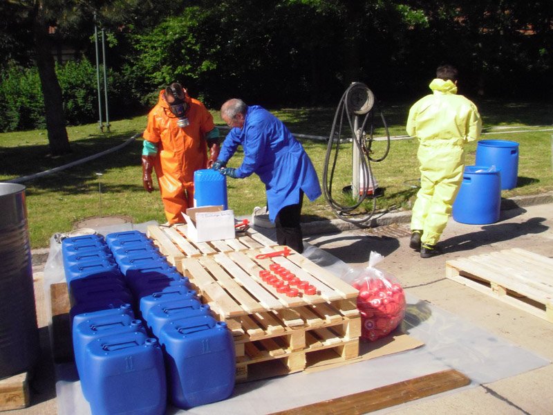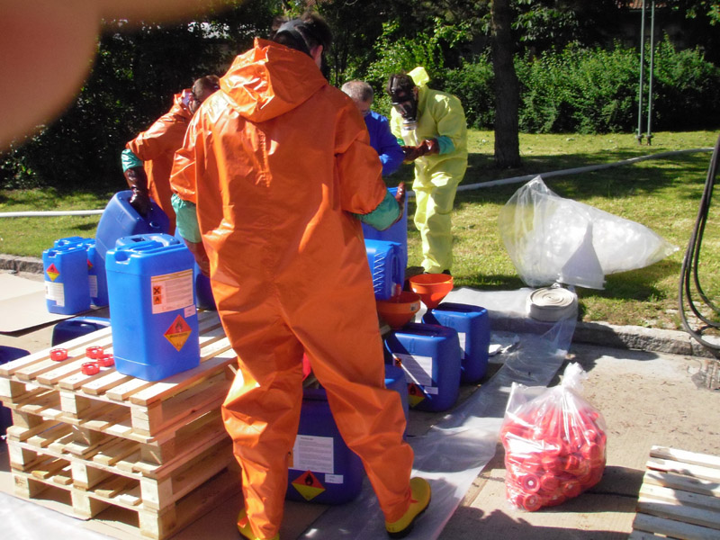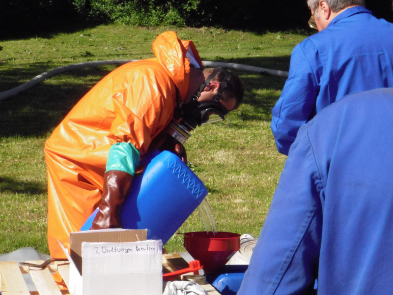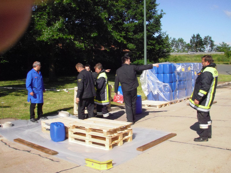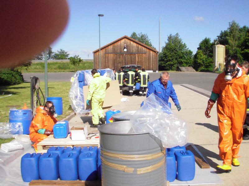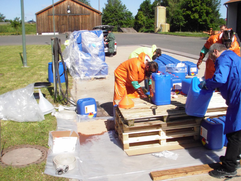 29.05.2009, 07:45 - 16:15 Uhr Gefahrgut umladen Die FFW Kirchroth wurde am Vortag von der Polizei informiert, dass am Freitag in der Autobahnmeisterei Kirchroth Gefahrgut umgefüllt werden muss. Für die Umfüllarbeiten rückte die Werkfeuerwehr von Wacker aus Burghausen an, die Feuerwehr Kirchroth war ursprünglich nur zur Brandsicherung vorgesehen. Letztlich arbeiteten aber beide Wehren Hand in Hand und haben gemeinsam die ca. 5000 Liter Peroxan, abgefüllt in nicht zugelassenen 25 Liter Kanistern, in zugelassene Kanister umgefüllt. Die Kanister wurden auf Paletten verpackt und auf einen LKW zum Weitertransport verladen.