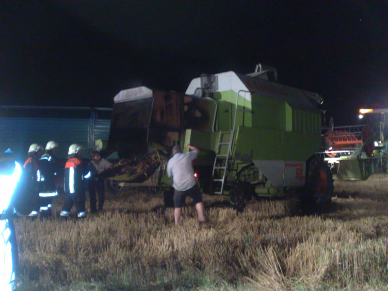 30.07.2009, 23:02 - 00:00 Uhr Mähdrescherbrand bei Oberzeitldorn Am Donnerstagabend wurden die Feuerwehren Kirchroth und Oberzeitldorn zu einem Mähdrescherbrand am Ortsrand von Oberzeitldorn alarmiert. Der Brand wurde vermutlich durch ein überhitztes Lager am Strohhäcksler verursacht und konnte durch die Kirchrother Wehr schnell unter Kontrolle gebracht werden. Nach den ersten Löscharbeiten wurde der Getreidebunker der landwirtschaftlichen Maschine entleert, damit das Getreide nicht unbrauchbar gemacht wurde. Zur Sicherheit wurde die Feuerwehr aus Parkstetten nachalarmiert, um die Löschwassernachfuhr sicherzustellen. Des weiteren wurde der Mähdrescher mit Hilfe der Parkstettener Wärmebildkamera auf eventuell noch vorhandene Glutnester untersucht.