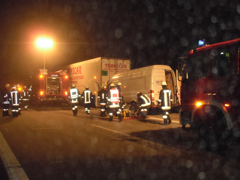 06.11.2009, 03:10 - 05:30 Uhr Am Freitag Morgen wurden die Feuerwehren aus Kirchroth, Parkstetten und Bogen zu einem Verkehrsunfall mit eingeklemmter Person auf die Autobahn zwischen den Anschlussstellen Kirchroth und Straubing alarmiert. KBM Uttendorfer meldete jedoch zwischenzeitlich, dass auf dem Autobahnabschnitt nicht zu erkennen sei. Auf Nachfrage bei der Polizei wurde bekannt, dass sich der Unfall zwischen Wörth Ost und Kirchroth ereignete. Zusätzlich zu den bereits alarmierten Feuerwehren wurde nun auch noch die FFW Wörth alarmiert. Die Feuerwehr Parkstetten befreite die Person aus dem Kleintransporter, der auf einen LKW aufgefahren war, und übergab sie dem Rettungsdienst.