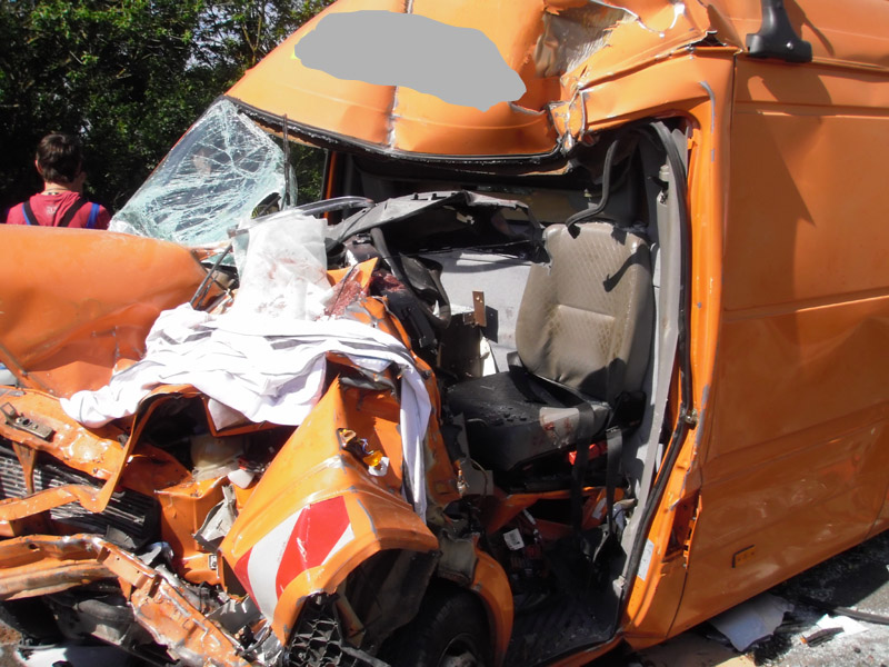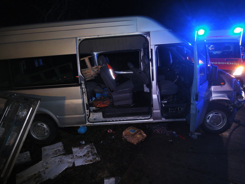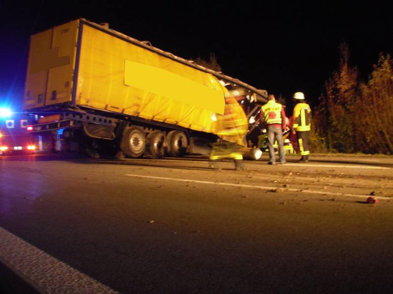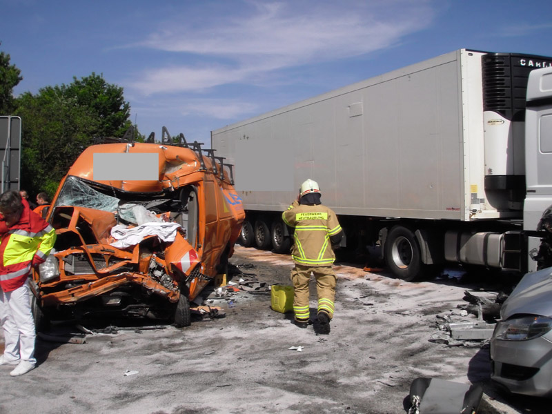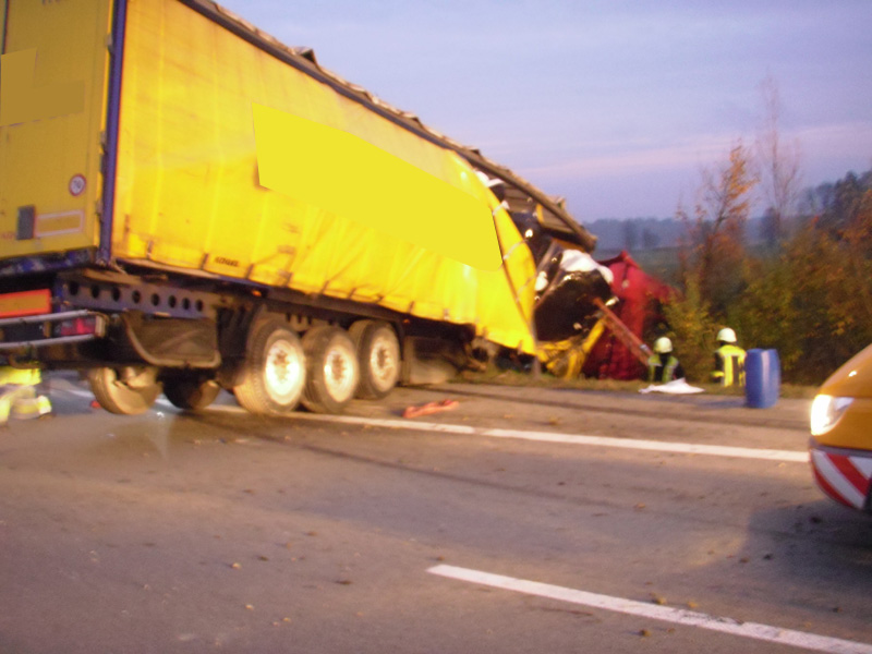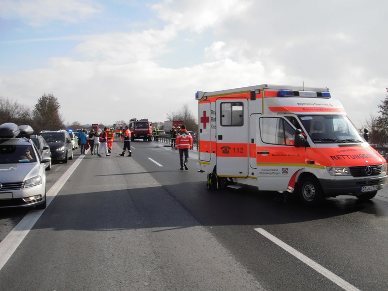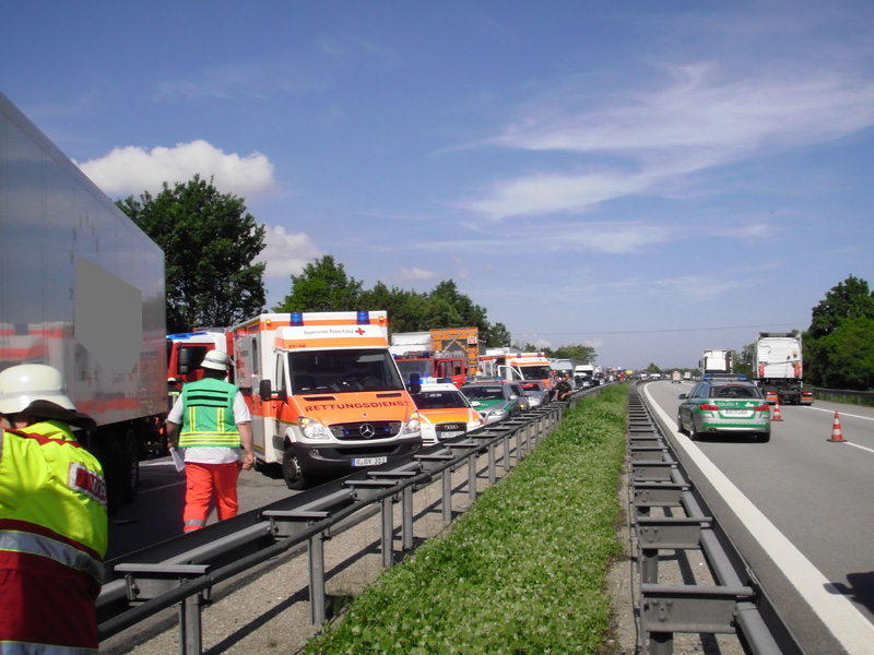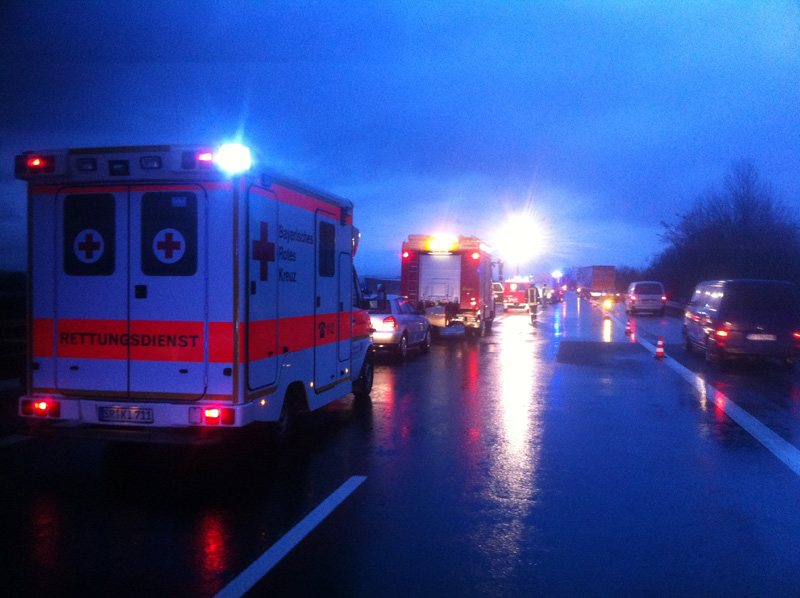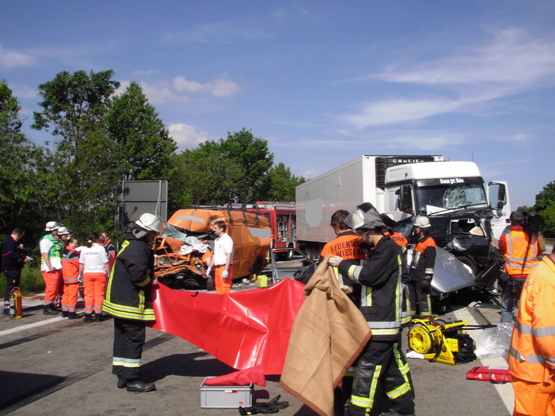 18.06.2013, Alarmierung: 03:29 Uhr Zu einem schweren Verkehrsunfall wurde die Feuerwehr Kirchroth in der Nacht zum Dienstag alarmiert. Ein mit 8 Personen besetzter Kleinbus war auf der A 3 in Fahrtrichtung Regensburg auf Höhe der Ausfahrt Wörth / Wiesent auf ein absicherndes Polizeifahrzeug aufgefahren. Bei dem Unfall ist eine Insassin des Kleinbusses ums Leben gekommen. Weitere Personen wurden zum Teil schwer verletzt. Bei dem für den Rückstau ursächlichen Unfall ist wenige hundert Meter weiter ein Transporter auf einen LKW aufgefahren. Der Fahrer wurde in seinem Fahrzeug eingeklemmt und konnte nicht mehr rechtzeitig gerettet werden, da das Gefährt Feuer gefangen hatte.