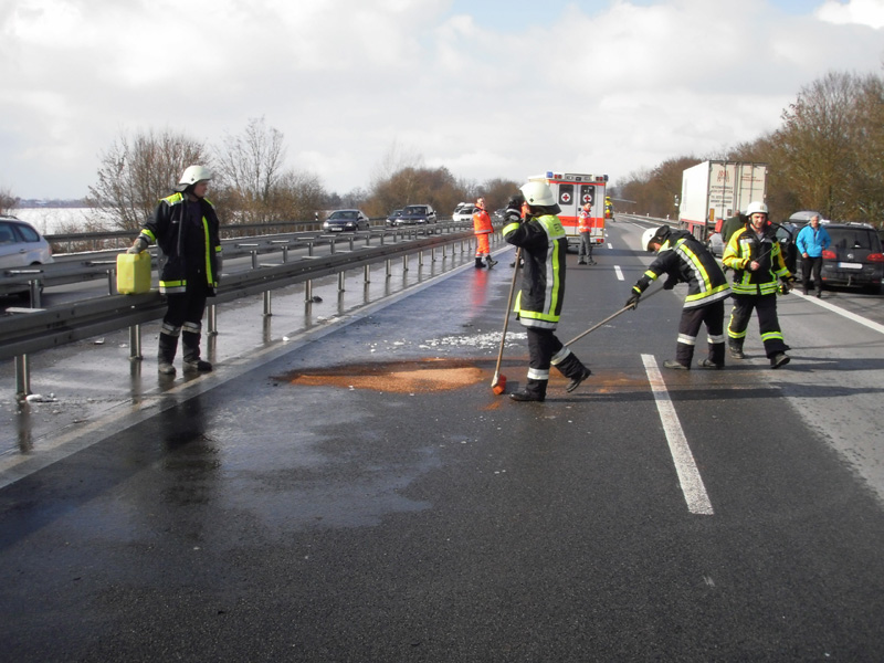 18.06.2013, Alarmierung: 13:58 Uhr Bereits zum dritten schweren Verkehrsunfall wurden wir heute auf die Autobahn alarmiert. Zwischen den Anschlussstellen Wörth Ost und Kirchroth war ein LKW auf ein Pannenfahrzeug aufgefahren. Entgegen der ursprünglichen Meldung, waren glücklicherweise keine Personen eingeklemmt. Die drei Verletzten wurden durch den Rettungsdienst in die umliegenden Kliniken transportiert. Der LKW, aus dessen Tank rund 600 Liter Diesel ausliefen, blieb so ungünstig auf einer Autobahnunterführung stehen, dass auch die darunter verlaufende Straße verunreinigt wurde. Auf der Autobahn waren die Wehren aus Kirchroth, Wörth und Wiesent im Einsatz, auf der Gemeindestraße die Feuerwehren Parkstetten und Obermiethnach.