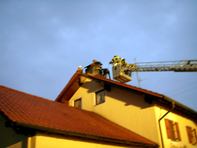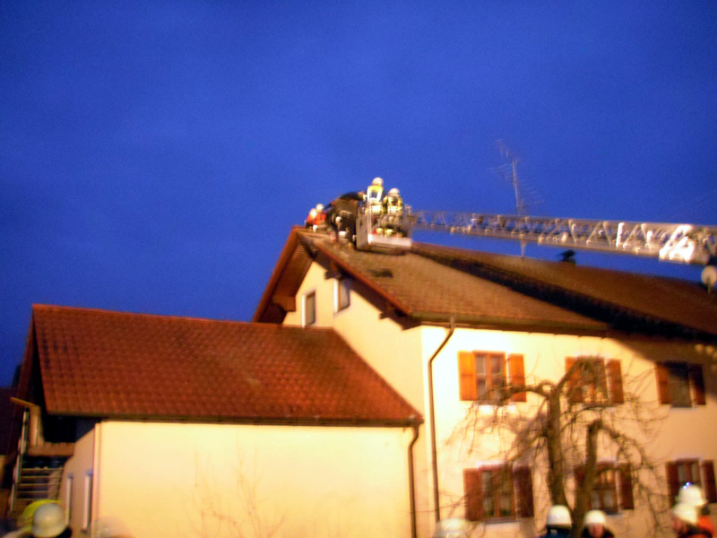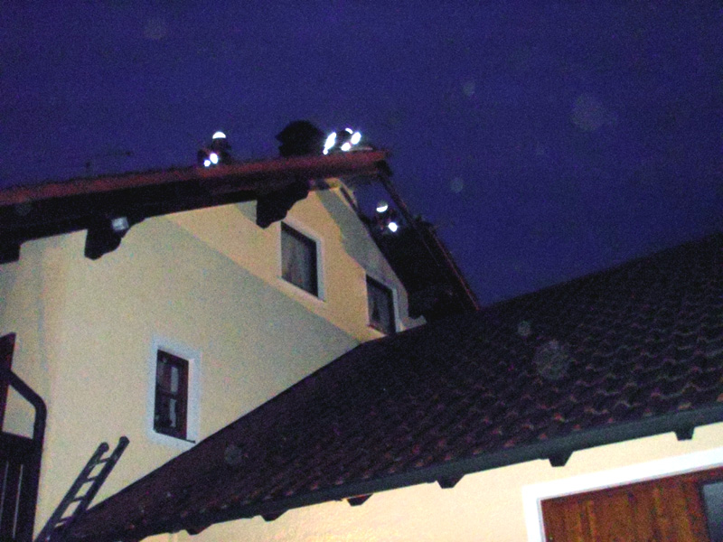 24.03.2013, Alarmierung: 04:52 Uhr Am Sonntag Morgen wurden die Feuerwehren aus Kirchroth, Niederachdorf, Pillnach, Pondorf, Wörth, Hofdorf und Straubing mit der Drehleiter zu einem Wohnhausbrand nach Niederachdorf alarmiert. Noch während der Anfahrt teilte die Feuerwehr Niederachdorf, die bereits etwas eher über den Druckknopfmelder im Ort alarmiert wurde, mit, dass der Brand am Dachstuhl bereits gelöscht sei. Die Feuerwehren des Landkreises Regensburg wurden daraufhin bereits wieder abbestellt. Die Feuerwehr Kirchroth kontrollierte die Brandstelle mit der Wärmebildkamera auf noch vorhandene Glutnester, die dann noch gekühlt wurden. Ein örtlicher Zimmerer deckte sofort den betroffenen Bereich des Daches aus und entfernte abgebrannte Bretter und verschloss das Dach wieder behelfsmäßig. Nur durch das frühzeitige erkennen des Brandes konnte glücklicherweise Schlimmeres verhindert werden.