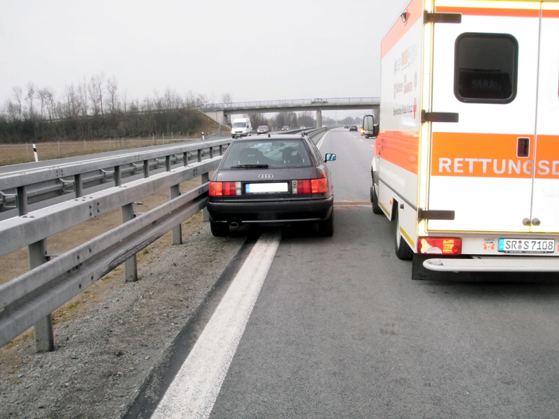 31.03.2013, Alarmierung: 12:26 Uhr Die Feuerwehr Kirchroth wurde am Ostersonntag zur Mittagszeit zu einem Verkehrsunfall auf der Autobahn zwischen Kirchroth und Wörth alarmiert. Dort war ein PKW in die Mittelleitplanke gefahren. Das Fahrzeug stand auf der Überholspur. Zur Absicherung der Einsatzstelle wurde die Feuerwehr Parkstetten mit ihrem VSA nachalarmiert. Die Wehr aus Kirchroth übernahm neben der Verkehrsabsicherung noch das Binden ausgelaufener Betriebsstoffe. Der PKW wurde durch die Einsatzkräfte auf den Standstreifen geschoben, woraufhin der Einsatz der Feuerwehr beendet werden konnte.