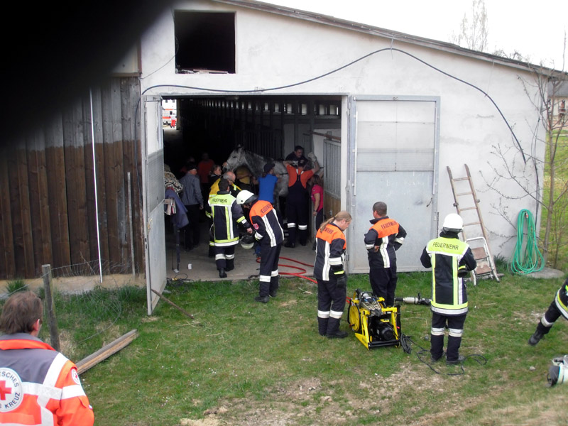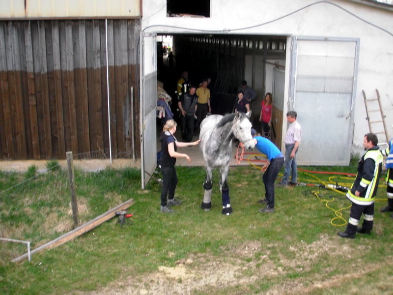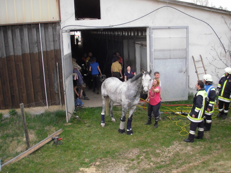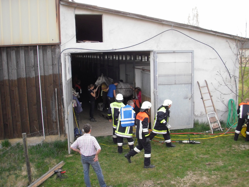 17.04.2013, Alarmierung: 17:27 Uhr Die Feuerwehren Kirchroth und Aufroth wurden zur Reitanlage nach Aufroth alarmiert. Eine Katze ist im dortigen Pferdestall auf den Rücken des Pferdes gesprungen. Dies hat sich dabei so erschreckt, dass es versuchte, mit einem Sprung die Pferdebox zu verlassen. Unglücklicher Weise landete das Pferd dann mit dem Bauch auf der Tür der Box und konnte weder vor noch zurück. An der Einsatzstelle wurde vorsichtshalber Spreizer und Schneidgerät in Stellung gebracht, musst aber nicht eingesetzt werden. Das Scharnier der Box konnte mit einer Metallsäge abgeschnitten werden. Das befreite Pferd wurde von einem hinzu gerufenen Tierarzt untersucht.