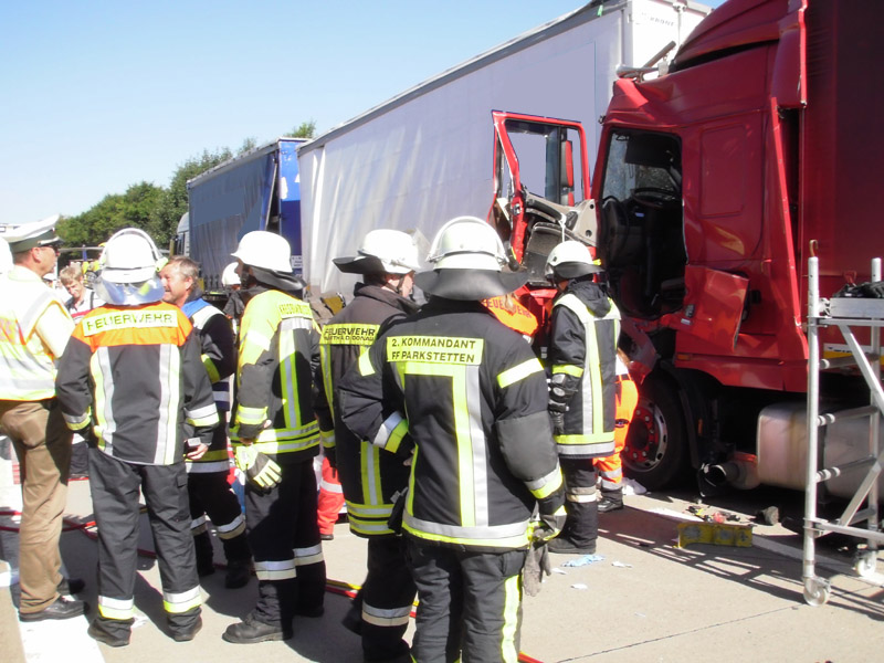 22.07.2013, Alarmierung: 09:00 Uhr Zu einem schweren Verkehrsunfall mit 3 beteiligten LKWs und einer eingeklemmten Person wurden die Feuerwehren aus Kirchroth, Parkstetten, Steinach, Straubing und Bogen auf die Autobahn zwischen Kirchroth und Wörth alarmiert. Dort war ein LKW auf ein Stauende aufgefahren, der Fahrer wurde in seinem Fahrzeug eingeklemmt und musst schwer verletzt mit schwerem hydraulischem Gerät bereit werden. Die Fahrbahn musste zeitweise vollkommen für den Verkehr gesperrt werden, eine Verkehrsabsicherung wurde eingerichtet.