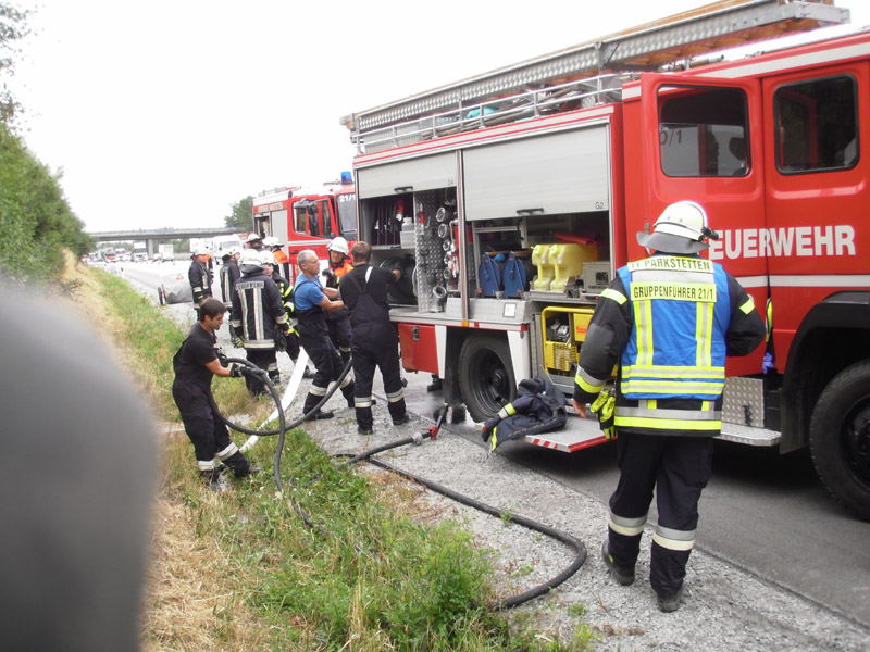 31.07.2013, Alarmierung: 08:42 Uhr Die Feuerwehren aus Kirchroth, Parkstetten und Straubing mit den Löschzügen Nord und Zentrum wurden zu einem LKW-Brand auf die Autobahn zwischen Kirchroth und Wörth alarmiert. Der Silotankzug, der mit Kunststoffgranulat gefüllt war, brannte jedoch glücklicherweise nicht, es war lediglich eine Bremse heiß gelaufen und hatte das Qualmen angefangen. Die Bremse wurde durch die Feuerwehr Kirchroth gekühlt, eine Verkehrsabsicherung wurde mit Hilfe des VSA aus Parkstetten erstellt. Die Einsatzstelle konnte zügig an die Polizei übergeben werden. Die Feuerwehren aus Straubing brauchten nicht mehr eingesetzt werden.