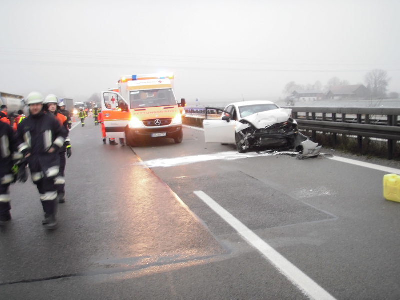 04.12.2013, Alarmierung: 07:44 Uhr Auf der A3 kam es zu einem Auffahrunfall, bei dem ein PKW auf einen LKW auffuhr. Da in der Erstmeldung von einer eingeklemmter Person ausgegangen wurde, wurden die Feuerwehren aus Kirchroth, Parkstetten und Bogen zur Unfallstelle entsandt. Glücklicherweise war niemand eingeklemmt, die Beifahrerin zog sich mittelschwere Verletzungen zu und wurde bis zum Eintreffen des Rettungsdienstes von uns betreut, der Fahrer wurde leicht verletzt. Des weiteren befand sich ein kleiner Hund im Fahrzeug, dieser wurde von der Feuerwehr Kirchroth betreut und nach dem Einsatz an Mitarbeiter des Tierheims Straubing übergeben. An der Einsatzstelle wurde des weiteren die Verkehrsabsicherung und die Reinigung der Einsatzstelle übernommen.