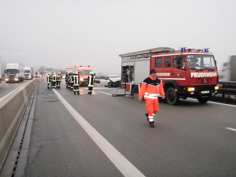 07:05 Uhr Verkehrsunfall, BAB 3 Wörth - Kirchroth Die Feuerwehren Kirchroth und Wörth wurden zu einem Verkehrsunfall auf die Autobahn zwischen den AS Wörth / Ost und AS Kirchroth alarmiert. Aus bisher ungeklärter Ursache ist ein Kleintransporter auf einen LKW aufgefahren. Da keine Personen eingeklemmt waren, wurde die Feuerwehr Kirchroth nicht mehr eingesetzt. Die Verletzten wurden vom Rettungsdienst in Krankenhäuser eingeliefert.