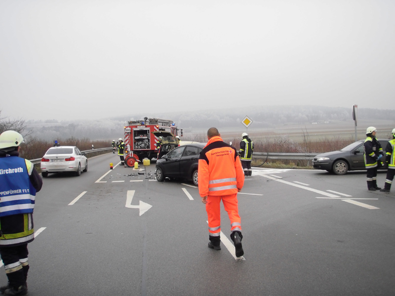 09:54 Uhr Verkehrsunfall, St 2125 Höhe Bachhof Die Feuerwehren Kirchroth und Kößnach wurden zu einem Verkehrsunfall mit mehreren PKWs auf die Staatsstraße 2125 Kirchroth Richtung Straubing Höhe Bachhof alarmiert. Dort ereignete sich bei der Einfahrt nach Kirchroth ein Unfall mit zwei Fahrzeugen. Im weiteren Verlauf ereignete sich ein weiterer Unfall, bei dem wiederum zwei PKWs aufeinander auffuhren. An der Einsatzstelle wurden auslaufende Betriebsstoffe gebunden und der Verkehr umgeleitet.