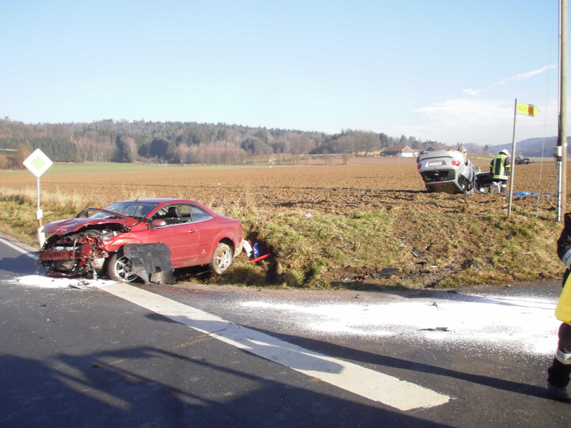 10:49 Uhr Verkehrsunfall mit PKW-Überschlag, Kellerbergkreuzung, St 2148 Kirchroth - Saulburg Zu einem PKW-Überschlag wurden die Feuerwehren Kirchroth und Aufroth auf die Staatsstraße 2148, Kirchroth Richtung Saulburg zur Kellerbergkreuzung alarmiert. Die Insassin eines PKWs war von Obermiethnach unterwegs in Richtung Aufroth. An der Kreuzung mit der St 2148 hat sie das Stoppschild überfahren und dabei die Vorfahrt eines PKW-Fahrers, der in Richtung Saulburg unterwegs war, missachtet, woraufhin es zum Zusammenstoß der beiden Fahrzeuge kam. Der Aufprall war so heftig, dass es eines der Fahrzeuge sogar überschlug. Die beiden Fahrzeuglenker wurden vom Rettungsdienst betreut und in ein Krankenhaus transportiert. Die Feuerwehren kümmerten sich um das Binden von ausgelaufenen Betriebsstoffen und sicherten die Unfallstelle ab. Durch die Landung von Rettungshubschrauber Christoph 15 musste die St 2148 vorübergehend komplett für den Verkehr gesperrt werden.