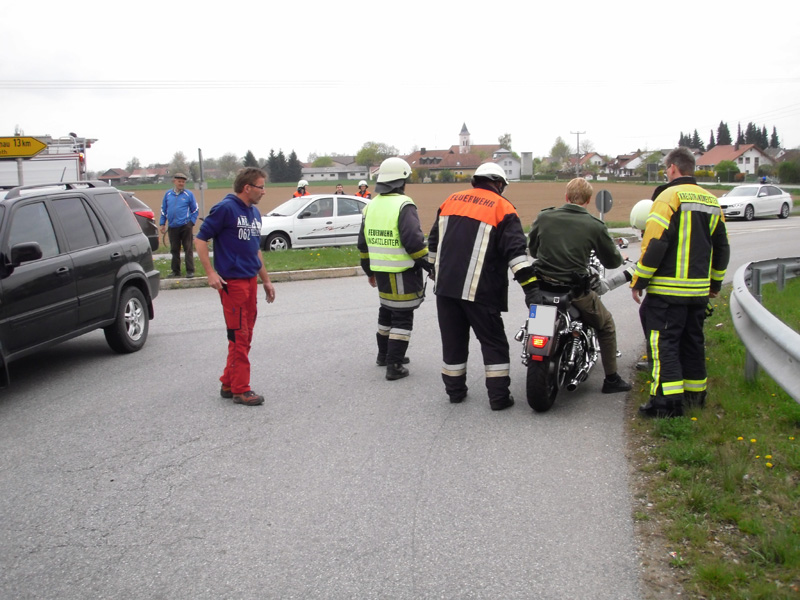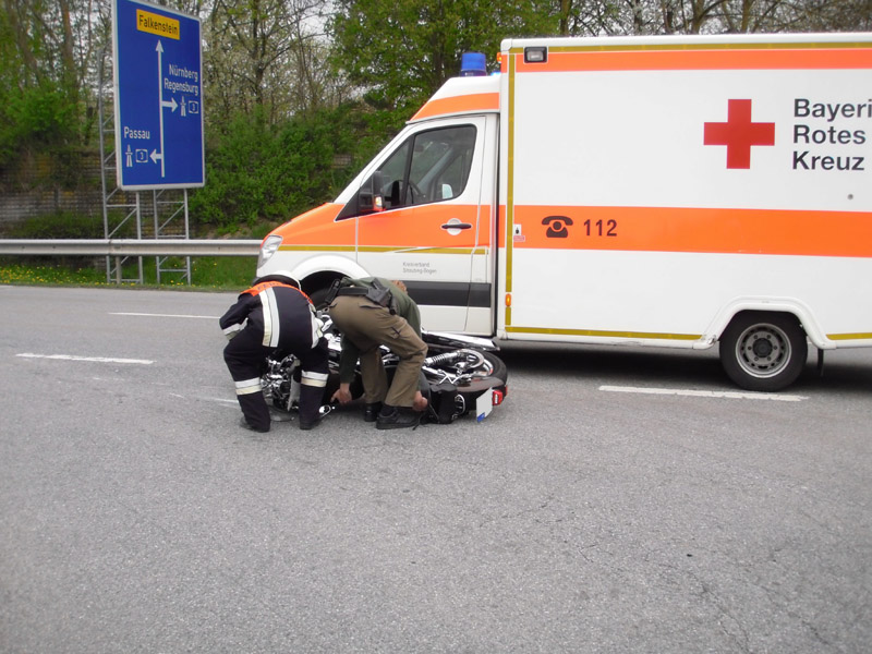 15:34 Uhr Verkehrsunfall mit Motorrad, Dekan-Seitz-Straße Die Feuerwehr Kirchroth wurde zu einem Verkehrsunfall mit Motorrad bei Kirchroth alarmiert. Der Motorradfahrer wollte aus Richtung Autobahn kommen nach Kirchroth einbiegen. Durch einen Fahrfehler kam er ohne Fremdeinfluss zu Sturz und verletzte sich an der Schulter. Die Einsatzstelle wurde bis zu deren Räumung abgesichert, der Verletzte wurde gemeinsam mit dem Helfer vor Ort betreut.