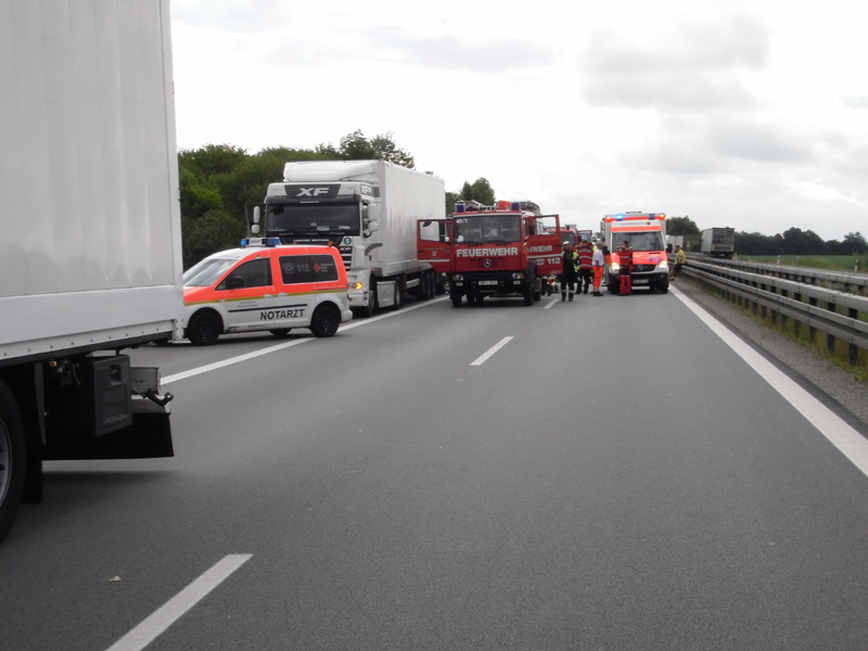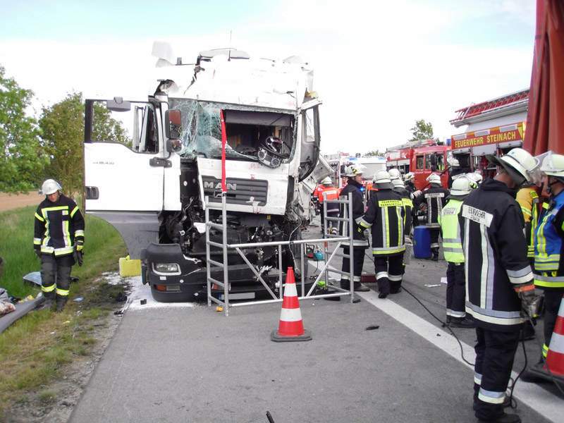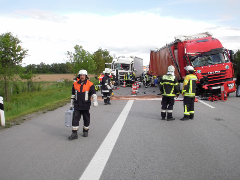 17:00 Uhr Verkehrsunfall mit LKWs mit eingeklemmter Person, BAB 3 Steinach - Straubing Eine Vielzahl an Feuerwehren wurde am Dienstag zu einem Verkehrsunfall mit mehreren LKWs mit eingeklemmten Personen auf die Autobahn zwischen Steinach und Kirchroth alarmiert. Durch eine Kettenreaktion kam es an einen Stauende zu einem Auffahrunfall mit insgesamt drei beteiligten LKWs. Der Fahrer des letzten Lasters wurde in seinem Fahrzeug eingeklemmt und musste von den Feuerwehren mit schwere Rettungsgerät und mit einem Seilzug befreit werden. Des weiteren mussten die Feuerwehren größere Mengen von auslaufenden Betriebsstoffen binden, einen Dieseltank auspumpen und die Fahrbahn reinigen. Zur Bergung der Fahrzeuge wurde im weiteren Verlauf das THW Straubing hinzugezogen. Die Autobahn war bis in die Nacht hinein komplett für den Verkehr gesperrt.