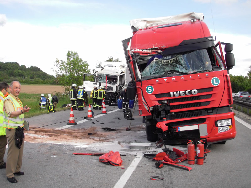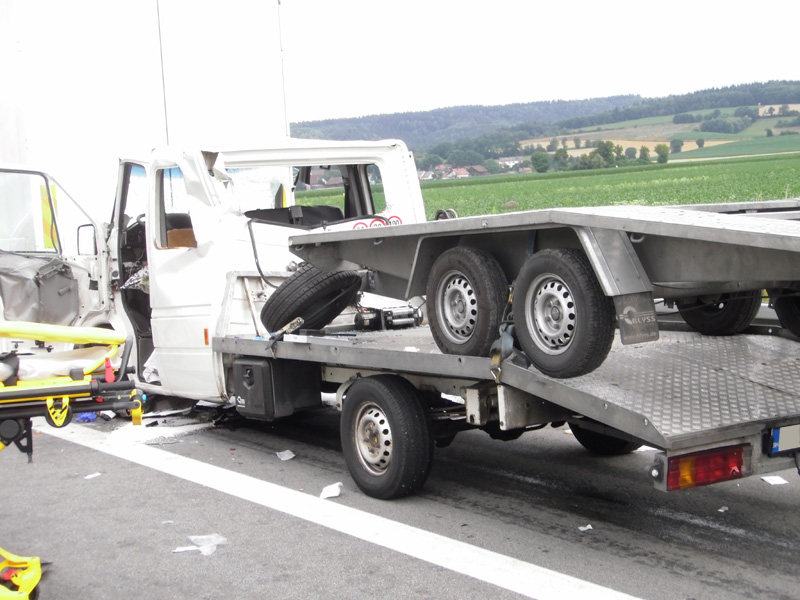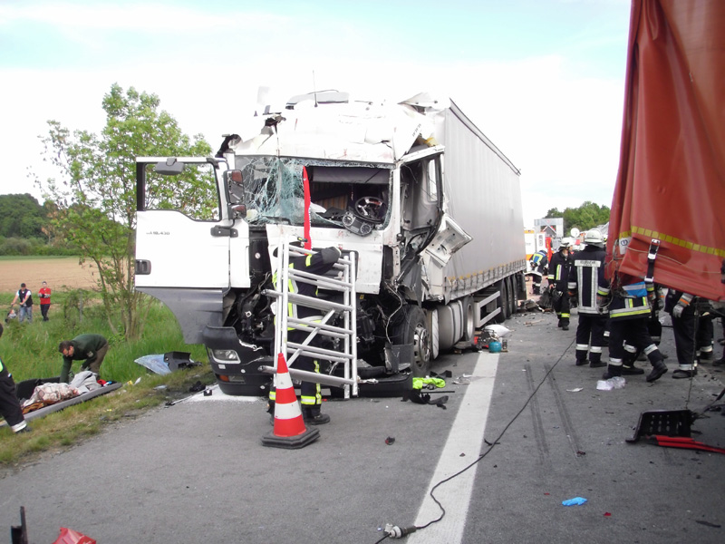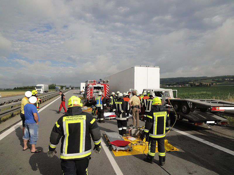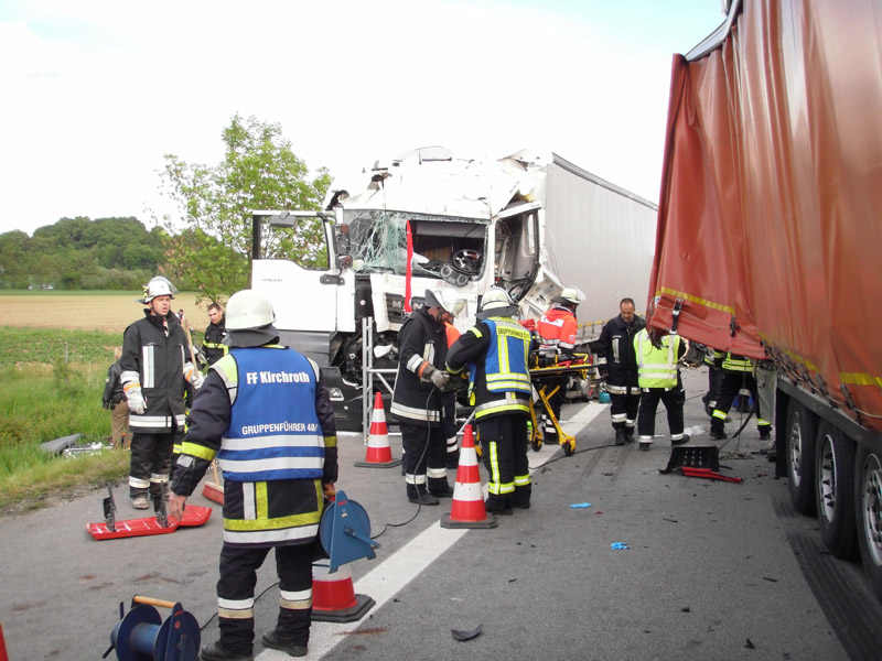 08:04 Uhr tödlicher VU mit LKW mit eingeklemmter Person, BAB 3 Kirchroth - Wörth Die Feuerwehren aus Kirchroth, Parkstetten und Straubing wurden zu einem Verkehrsunfall mit einem LKW mit eingeklemmten Personen alarmiert. Der Unfall ereignete sich wieder einmal an einem Stauende, bedingt durch die Autobahnbaustelle. Ein Transporterfahrer ist auf einen voraus fahrenden LKW aufgefahren. Der Fahrer wurde in seinem Fahrzeug eingeklemmt, er erlitt so schwere Verletzungen, dass er nach der Rettung aus seinem Fahrzeug noch an der Unfallstelle verstarb. Der Beifahrer wurde nicht eingeklemmt und mit schwersten Verletzungen in ein Krankenhaus gebracht. An der Unfallstelle waren unter anderem zwei Rettungshubschrauber im Einsatz.