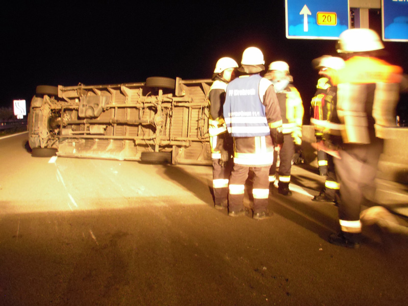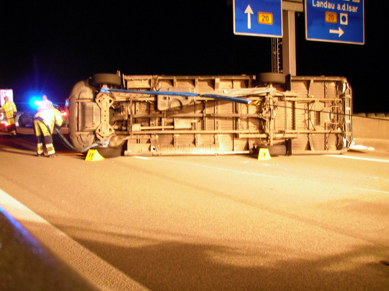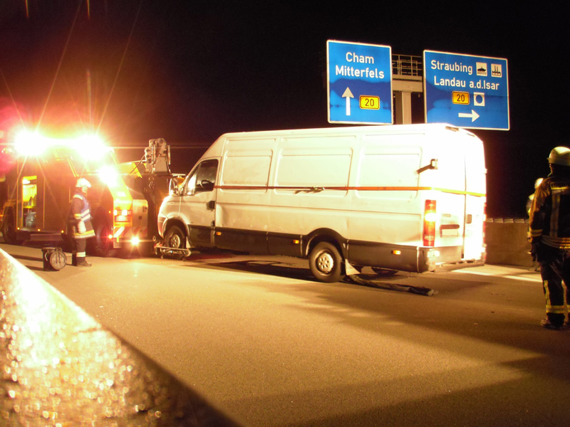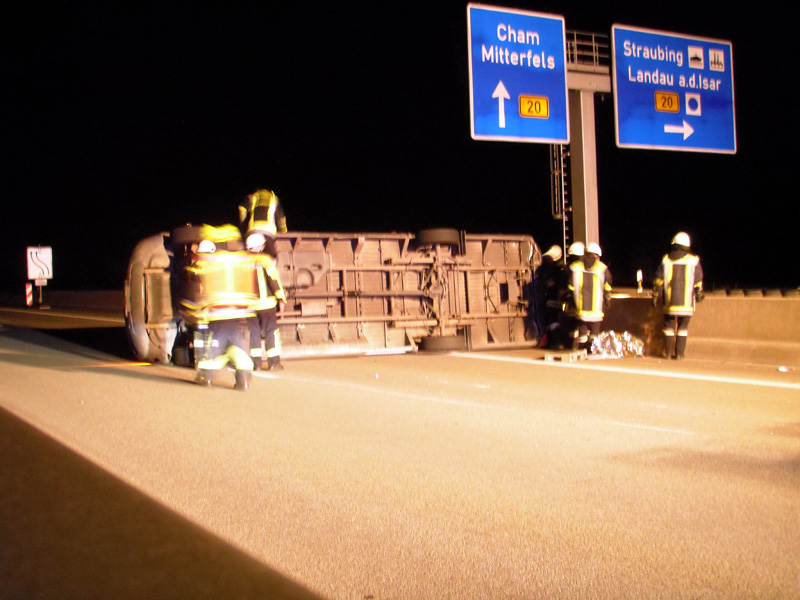 01:30 Uhr Transporter umgekippt, BAB 3 Kirchroth - Steinach Die Feuerwehren aus Kirchroth und Parkstetten wurde zu einem Verkehrsunfall auf die A3 zwischen Kirchroth und Steinach alarmiert. Dort war auf Höhe des Kleeblattes bei der B20 ein Transporter aus bisher ungeklärter Ursache auf die Seite gekippt und dann quer zur Fahrbahn liegen geblieben. Der Fahrer blieb unverletzt, die beiden Beifahrer mussten in umliegende Krankenhäuser gebracht werden. Die Feuerwehren richteten eine Umleitung des Verkehrs über das Kleeblatt ein, stellten den Brandschutz sicher und leuchteten die Unfallstelle aus.