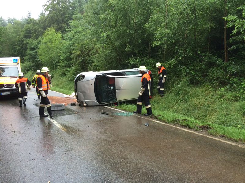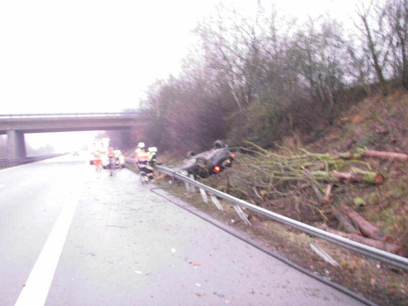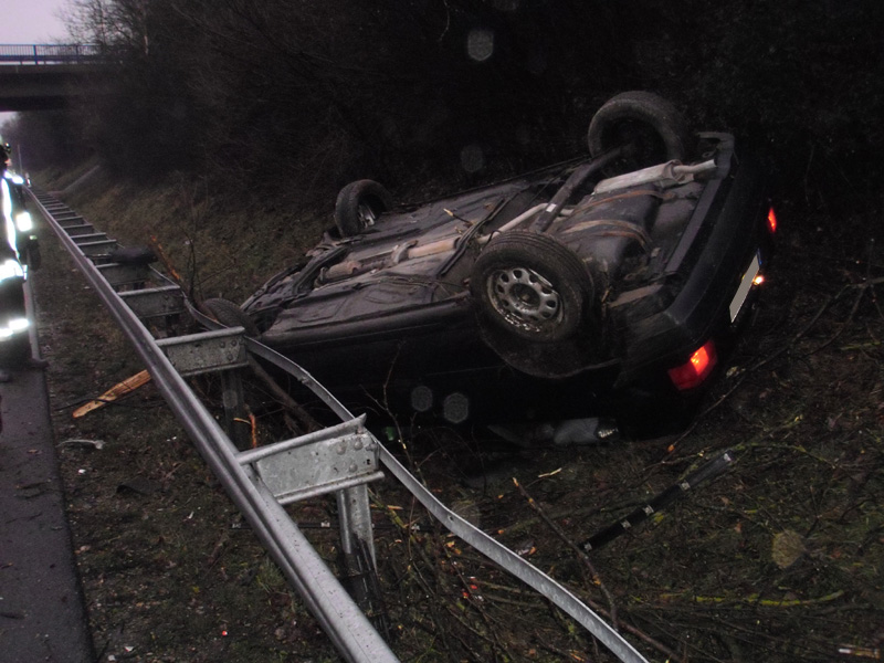 07:51 Uhr PKW-Überschlag, BAB 3, Kirchroth - Wörth Zu einem PKW-Überschlag wurden die Feuerwehren aus Kirchroth und Parkstetten auf die A3 zwischen Kirchroth und Wörth gerufen. Dort war ein PKW von der Fahrbahn abgekommen und hat sich im Grünstreifen zwischen Leitplanke und Lärmschutzwall überschlagen und blieb auf dem Dach liegen. Beide Fahrzeuginsassen konnten sich selbst aus dem Fahrzeug befreien und wurden mit leichten Verletzungen ins Straubinger Krankenhaus gebracht. Die Feuerwehren sicherten die Unfallstelle ab und kontrollierten das Unfallfahrzeug auf auslaufende Betriebsstoffe.
