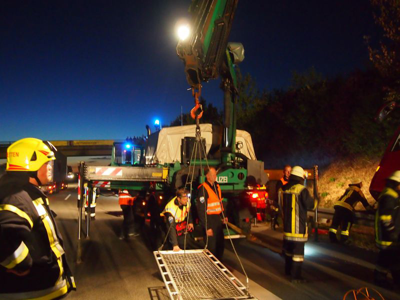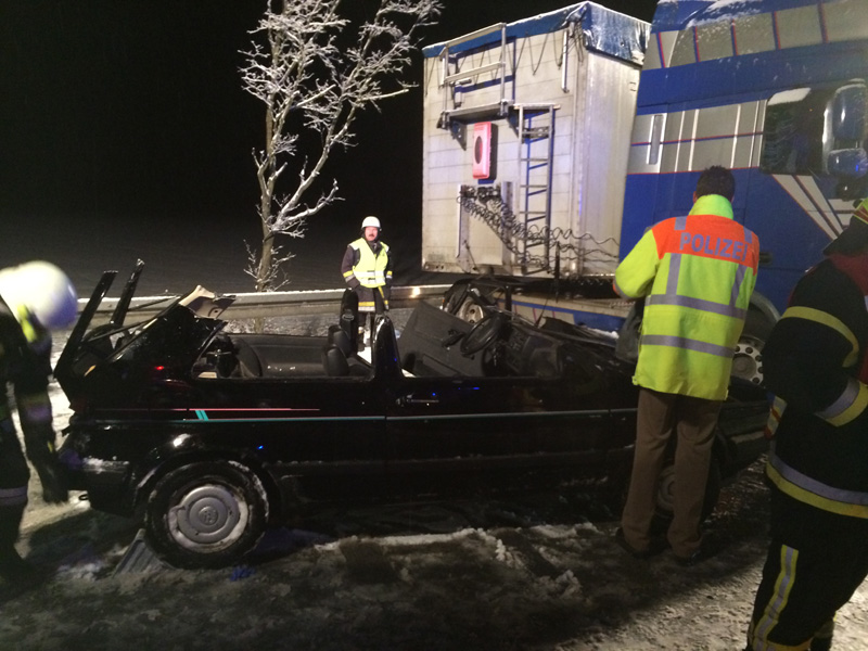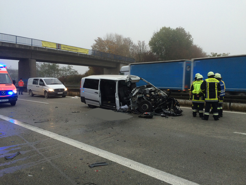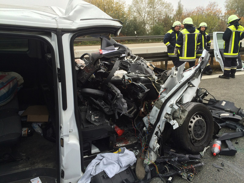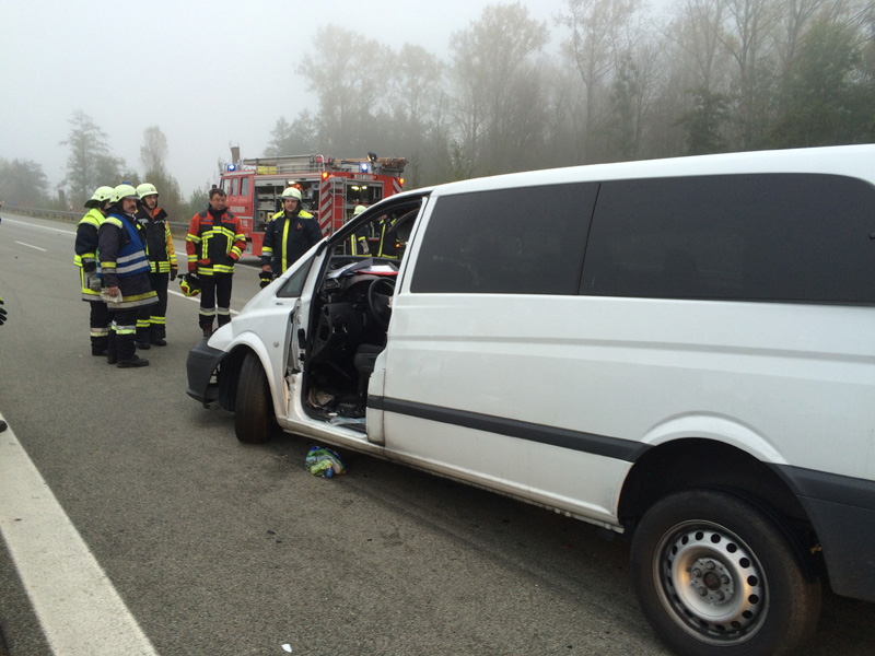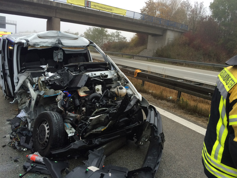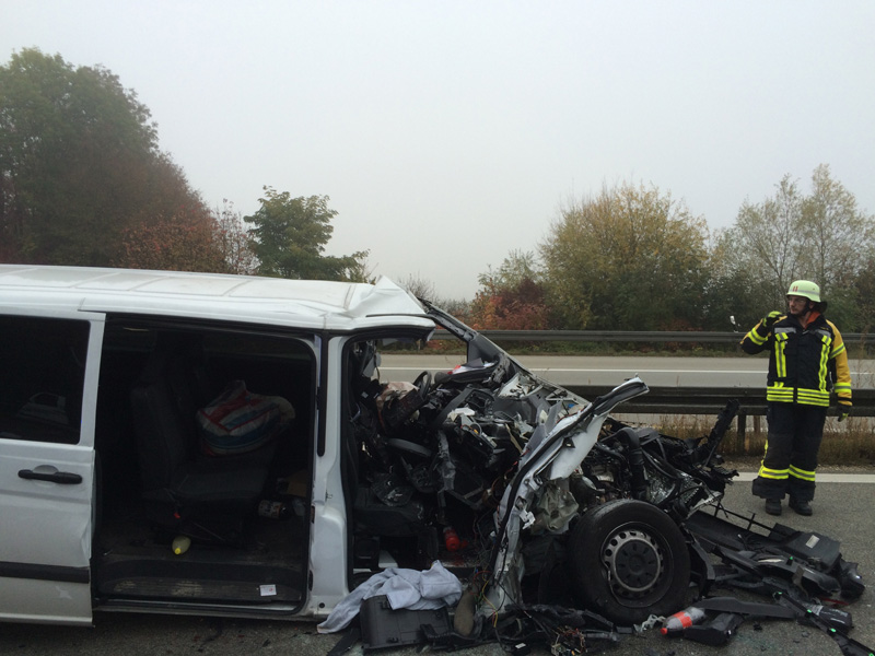 Alarmierung: 07:38 Uhr tödlicher Verkehrsunfall, A3 Kirchroth - Steinach Zu einem Verkehrsunfall mit mehreren PKWs ohne eingeklemmte Person wurden wir gemeinsam mit der FF Parkstetten auf die Autobahn alarmiert. Auf der Anfahrt wurde dann eine neue Lagemeldung durchgegeben, eine Person sei leblos im Fahrzeug eingeklemmt. An der Einsatzstelle angekommen mussten wir diese Lage leider bestätigen. Ein Van war auf einen vorausfahrenden Sattelzug aufgefahren. Auf Anweisung des Notarztes wurde die Person dann mit Spreizer, Schneidgerät und Hydraulikzylinder aus dem Fahrzeug befreit. Der Notarzt konnte jedoch nur noch den Tod des Beifahrers feststellen. Die fünf weiteren Insassen des Fahrzeugs konnten sich selbst aus dem Fahrzeug befreien und wurden mit teils schweren Verletzungen in umliegende Krankenhäuser eingeliefert. Im weiteren Verlauf wurde die Einsatzstelle an Polizei und Autobahnmeisterei übergeben, die Autobahn war noch mehrere Stunden für den Verkehr gesperrt.