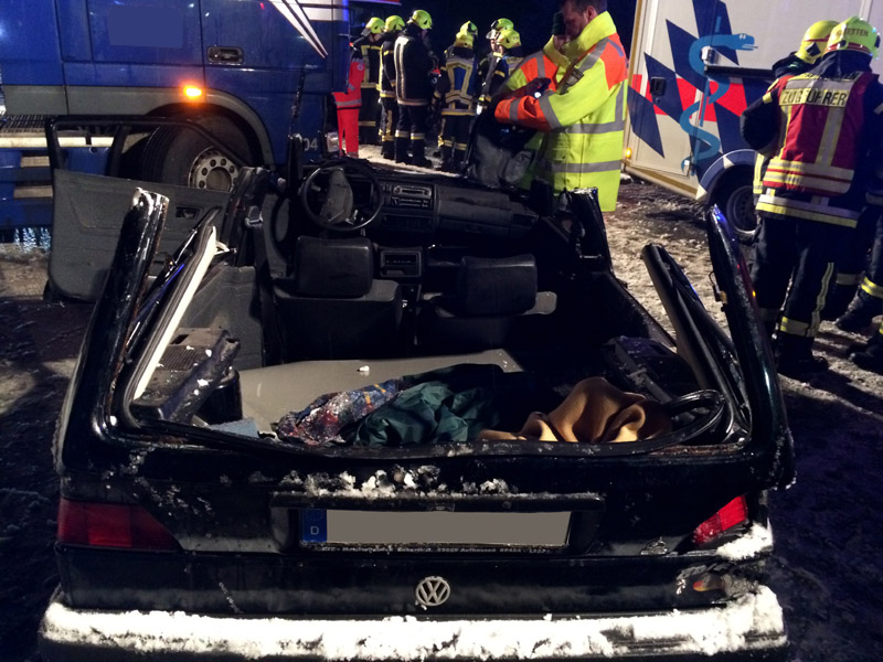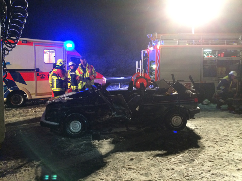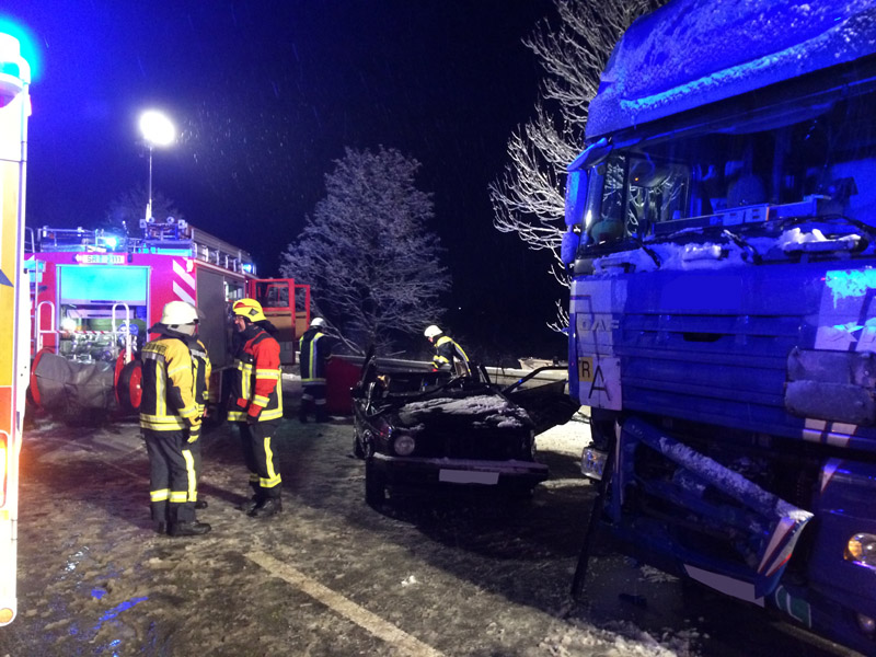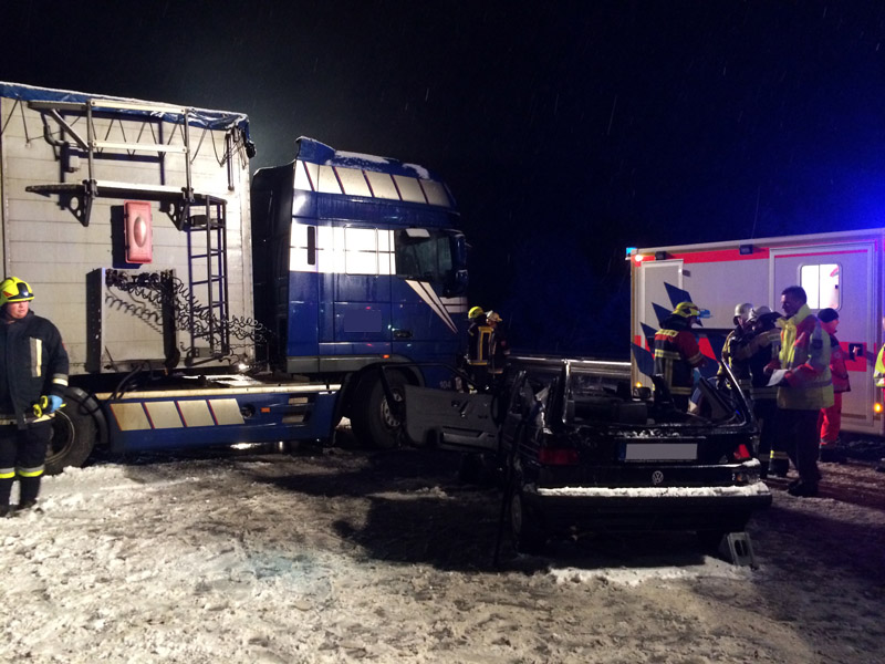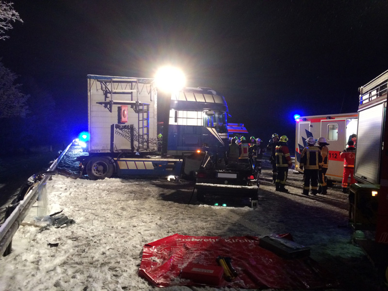05:17 Uhr VU mit eingeklemmter Person, BAB 3, Kirchroth - Wörth Die Feuerwehren aus Kirchroth, Parkstetten und Straubing wurden am frühen Montagmorgen auf die Autobahn zu einem Verkehrsunfall mit eingeklemmter Person alarmiert. Ein PKW-Fahrer war mit seinem Fahrzeug auf schneebedeckter Fahrbahn ins Schleudern geraten, ein hinter ihm fahrender Sattelschlepper konnte einen Zusammenstoß nicht mehr vermeiden. Dabei wurde der Fahrer des PKW in seinem Fahrzeug eingeklemmt und musste von den Feuerwehren Kirchroth und Parkstetten mit Spreizer und Schneidgerät befreit werden. Der Patient wurde mit dem Rettungsdienst ins Straubinger Krankenhaus gebracht. Der LKW Fahrer blieb unverletzt. Die Straubinger Feuerwehr musste mit ihrem Rüstwagen die Einsatzstelle nicht mehr anfahren.