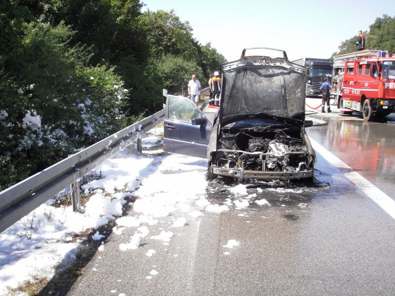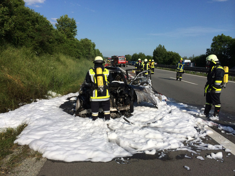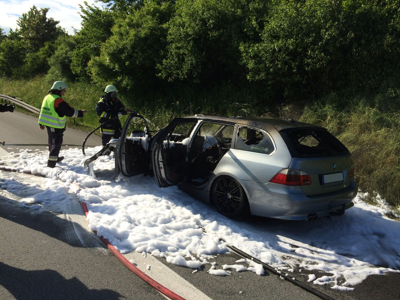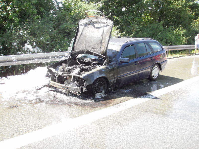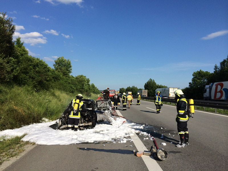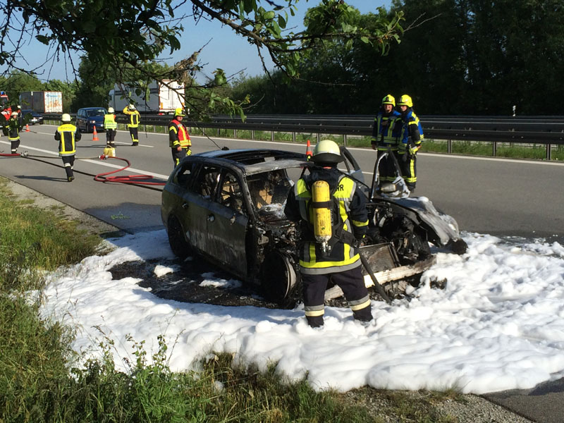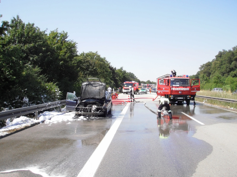 Alarmierung: 11:27 Uhr Brand PKW, A3, Kirchroth - Straubing Die Feuerwehren aus Kirchroth und Parkstetten wurden zu einem PKW-Brand auf die A3 zwischen Kirchroth und Straubing gerufen. Beim Eintreffen an der Einsatzstelle stand der vordere Teil des Fahrzeugs in Vollbrand. Unter schwerem Atemschutze wurde der PKW mit Mittelschaum abgelöscht. Für die Dauer der Löscharbeiten wurde Autobahn vollständig gesperrt. Verletzt wurde niemand.