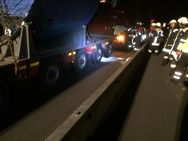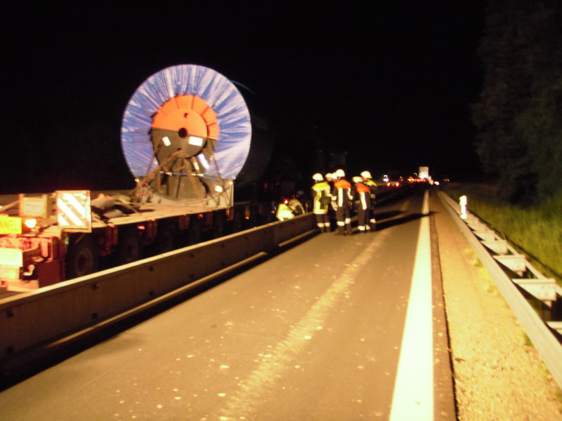 Alarmierung: 00:01 Uhr Ölspur, BAB 3, Kirchroth - Wörth Zu einer Ölspur wurden wir auf die Autobahn gerufen. Dort war an einem Schwertransporter ein Hydraulikschlauch geplatzt. Das hinterher fahrende Begleitfahrzeug hat die Situation sehr schnell erkannt, sodass die Ausdehnung der Ölspur recht gering blieb. Die Leitung wurde bereits vom Fahrer abgesperrt. Der Ölfleck wurde durch die Feuerwehr gebunden. Der Schwertransporter konnte mit Polizeibegleitung daraufhin bis zur Ausfahrt Wörth / Wiesent zum dortigen Schwertransporterstellplatz weiter fahren. Die FF Parkstetten unterstützte uns mit ihrem VSA bei der Absicherung der Einsatzstelle.