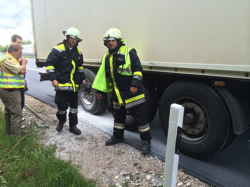 Alarmierung: 07:56 Uhr LKW-Brand, A3, Kirchroth - Wörth Zu einem LKW-Brand wurden die Feuerwehren aus Kirchroth, Parkstetten und Straubing mit dem LZ Nord und LZ Zentrum auf die Autobahn zwischen Kirchroth und Wörth gerufen. Den Brand an einem Reifen des Sattelaufliegers konnte der Lastwagenfahrer bis zum Eintreffen der Feuerwehren glücklicherweise selbst mit einem Feuerlöscher unter Kontrolle bringen. Der Reifen wurde mit der Wärmebildkamera kontrolliert. Unter Begleitung der Einsatzkräfte konnte der LKW seine Fahrt bis zur nächsten Ausfahrt fortsetzen. Die Straubinger Löschzüge konnten noch während der Anfahrt abdrehen.