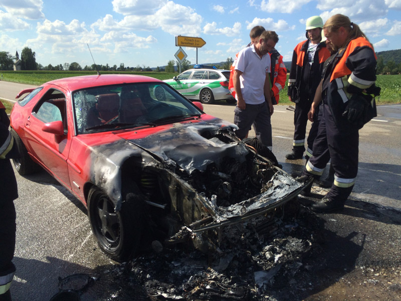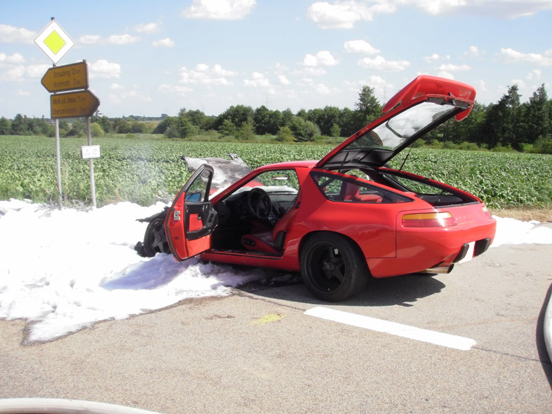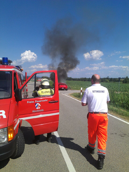 Alarmierung: 15:43 Uhr PKW-Brand, St2125 Höhe Weiher Zu einem PKW Brand wurden wir gemeinsam mit der FF Obermiethnach zur dortigen Ortsmitte gerufen. Da dort keine Feststellung gemacht werden konnte, wurde der Einsatzort von der ILS noch einmal neu abgefragt. Es stellte sich raus, dass der Brand auf der Staatsstraße zwischen Kirchroth und Oberzeitldorn beim Abzweig nach Obermiethnach war, daher wurde dann noch die ortszuständige FF Oberzeitldorn hinzu alarmiert. Dort hat ein Porsche aus unbekannter Ursache im Motorraum das Brennen begonnen. Der Brand konnte unter Einsatz von Atemschutz mit dem Mittelschaumrohr rasch unter Kontrolle gebracht werden. Der Fahrer des Porsche wurde mit leichten Verletzungen vom Rettungsdienst ins Krankenhaus gebracht. Die Feuerwehr kümmerte sich neben der Brandbekämpfung um die Verkehrsregelung sowie um die Fahrbahnreinigung.