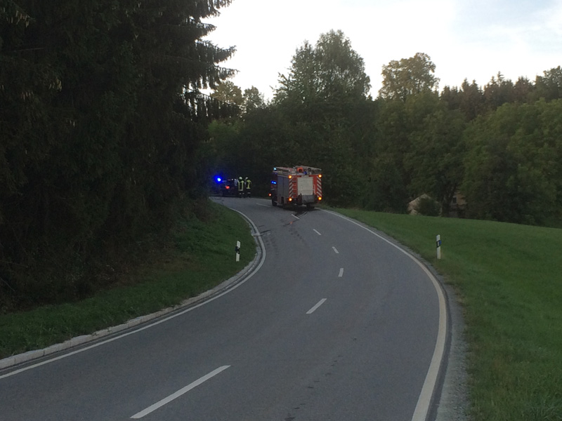Einsatzbeginn: 20:06 Uhr PKW Überschlag, SR64 Aufroth - Geßmannszell Zu einem PKW Überschlag ist es auf der Kreisstraße von Aufroth Richtung Geßmannszell gekommen. Zu diesem Einsatz war nur die FF Aufroth alarmiert. Da diese jedoch zu wenig Ölbindemittel dabei hatte und unser Gerätehaus wegen einer Übung besetzt war, wurde mit dem Mehrzweckfahrzeug Ölbindemittel zur Einsatzstelle gebracht.