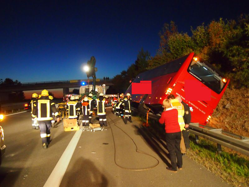 Alarmierung: 19:23 Uhr VU Bus, A3 Kirchroth - Wörth Zu einem Busunfall wurden wir gemeinsam mit der FF Parkstetten alarmiert. Der nur mit dem Fahrer besetzte Bus ist aus ungeklärter Ursache von der Fahrbahn abgekommen, auf eine Leitplanke gefallen und dann seitlich gegen eine Böschung gekippt. Der mittelschwer verletzte Fahrer konnte sich nicht selbst aus dem Fahrzeug befreien, da sich die Tür aufgrund der Schräglage nicht öffnen ließ. Sie wurde mit hydraulischen Rettungsgerät durch die Feuerwehr geöffnet. Ein zufällig zur Unfallstelle hinzu gekommener Unimog der Bereitschaftspolizei sicherte den Bus gegen weiteres umstürzen und unterstützte bei den Rettungsmaßnahmen. Des weiteren wurde der Verkehr an der Unfallstelle durch die Feuerwehr geregelt.