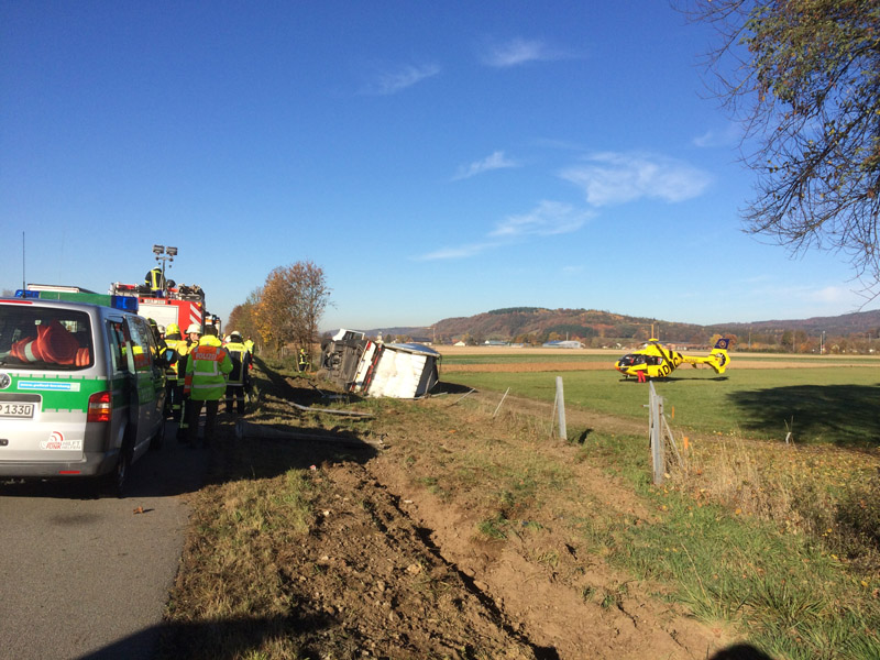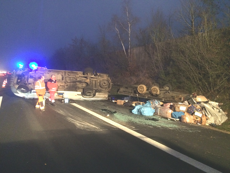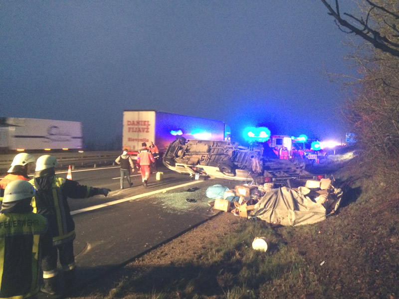 18.12.2015, Alarmierung: 07:03 Uhr VU Transporter, A3 Kirchroth - Wörth Zu einem Verkehrsunfall mit einem umgestürzten Kleintransporter wurden wir gemeinsam mit der FF Parkstetten auf die A3 zwischen Kirchroth und Wörth gerufen. Aus unbekannter Ursache hat der Fahrer des Anhänger-Gespanns die Kontrolle über sein Fahrzeug verloren, daraufhin kippten beide Fahrzeugteile um und blieben auf der Fahrbahn liegen. Die drei Fahrzeuginsassen wurden vom Rettungsdienst versorgt und in ein Krankenhaus gebracht. Auslaufender Diesel wurde gebunden, der Verkehr wurde an der Unfallstelle vorbei geleitet. Bis zu unserem Eintreffen war die Einsatzstelle bereits bestens abgesichert, da zufällig eine private Straßensicherungsfirma zur Unfallstelle gekommen war.