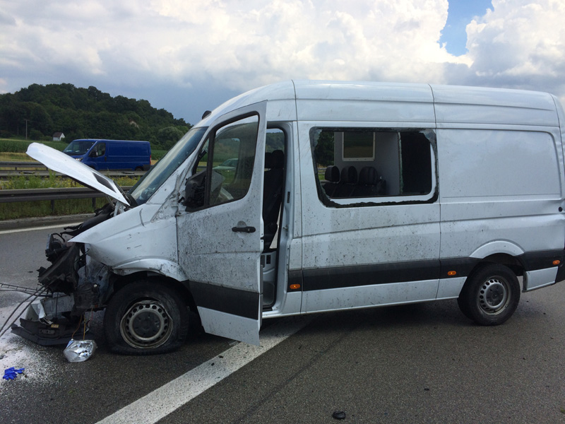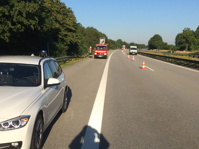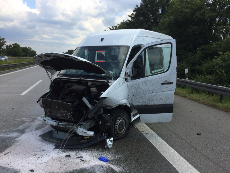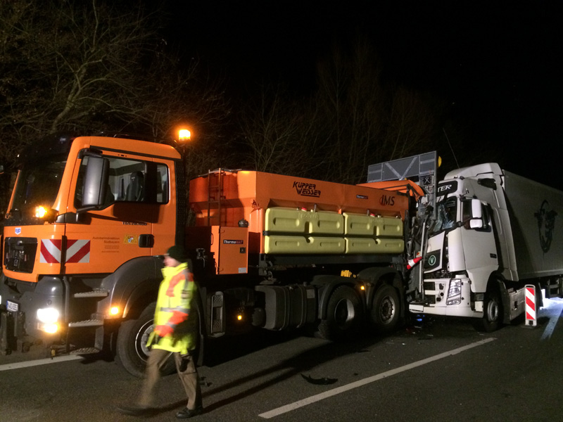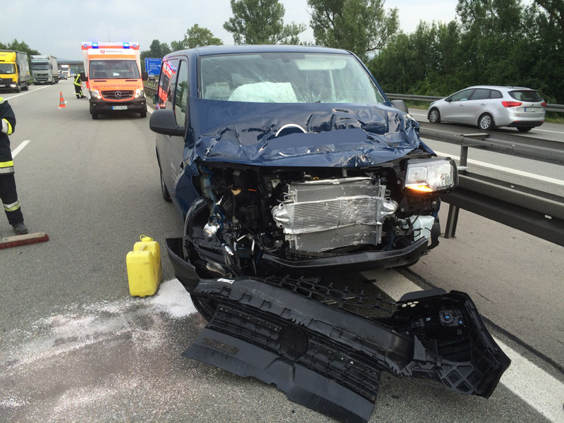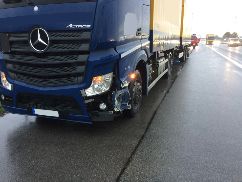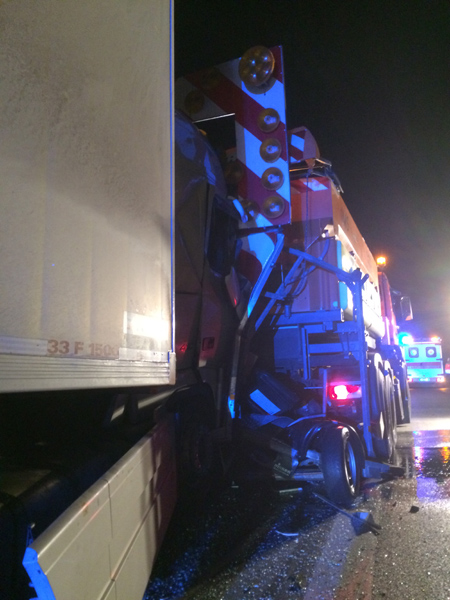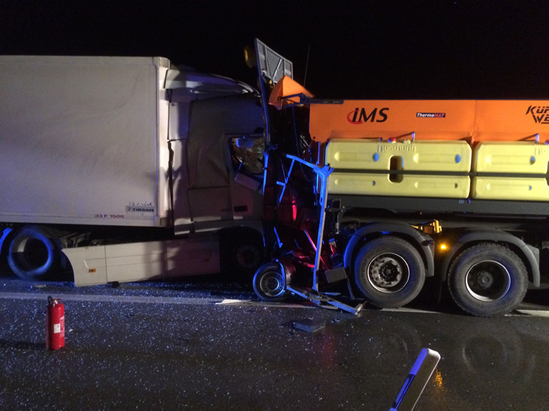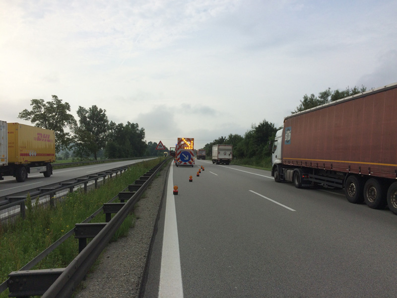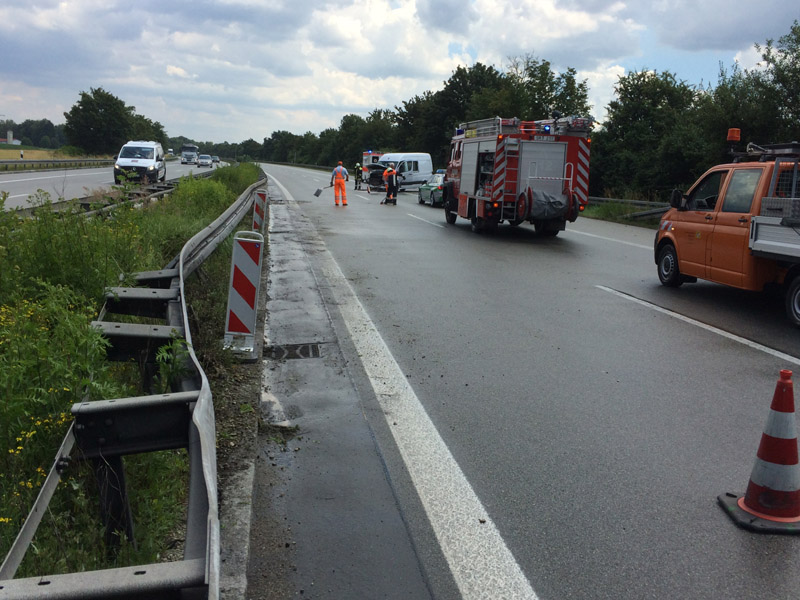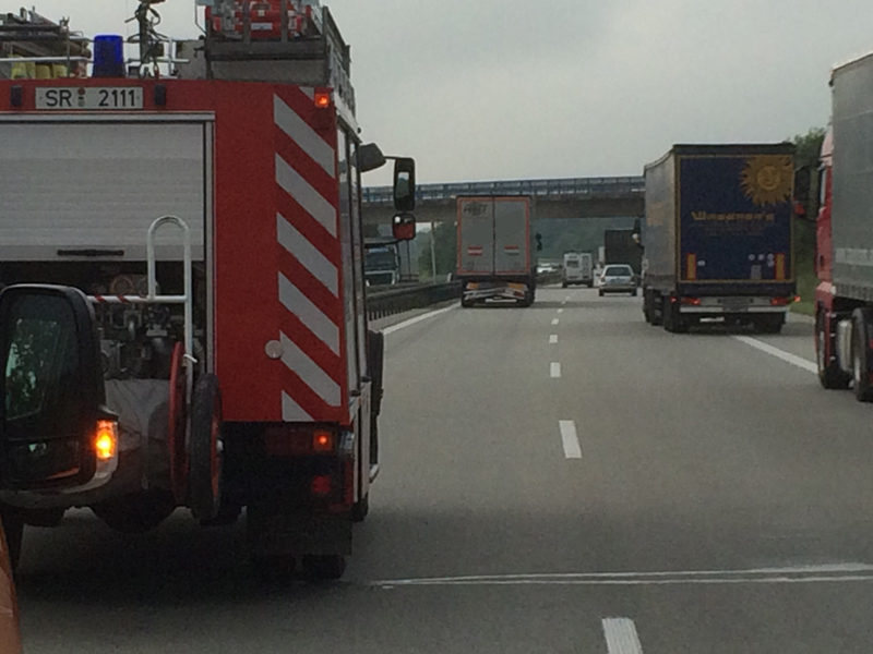 07:32 Uhr Verkehrsunfall, A3 Zu einem Verkehrsunfall wurden wir auf die Autobahn Richtung Steinach alarmiert. Dort war ein Kastenwagen hinten auf einen LKW aufgefahren, beide Fahrzeuge blockierten die Überholspur. Auslaufende Betriebsstoffe wurden gebunden, außerdem wurde die Überholspur mit dem neuen VSA gesperrt.