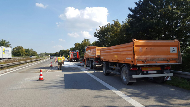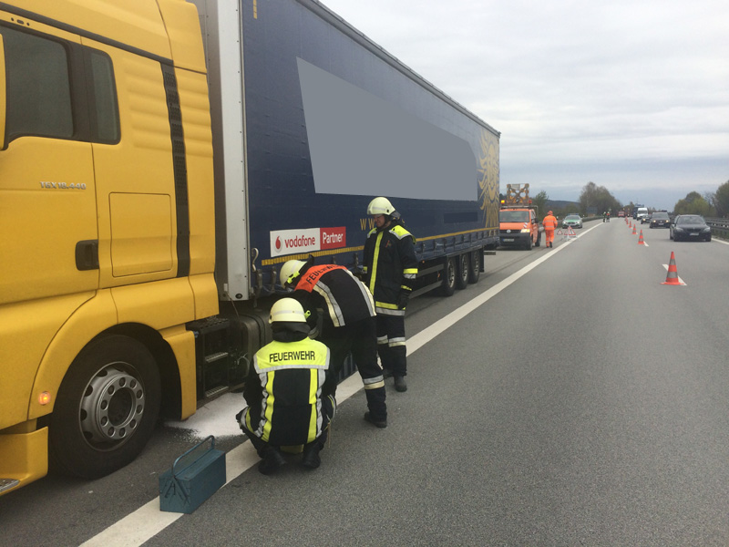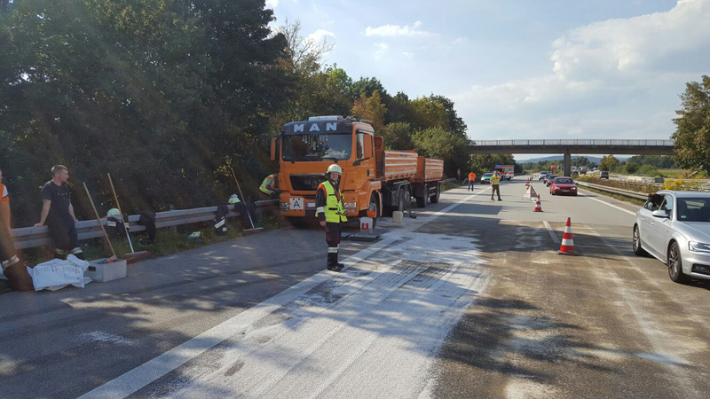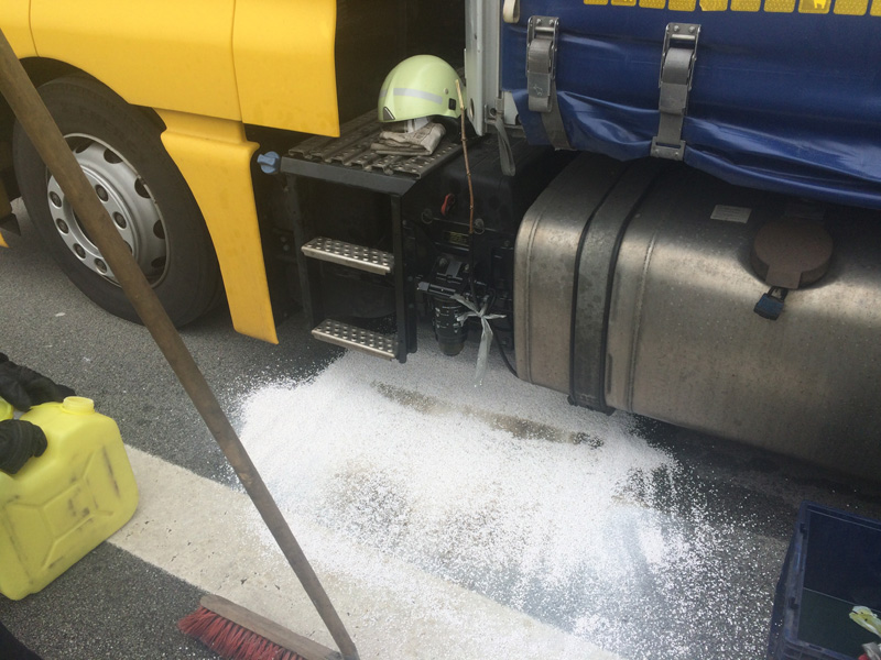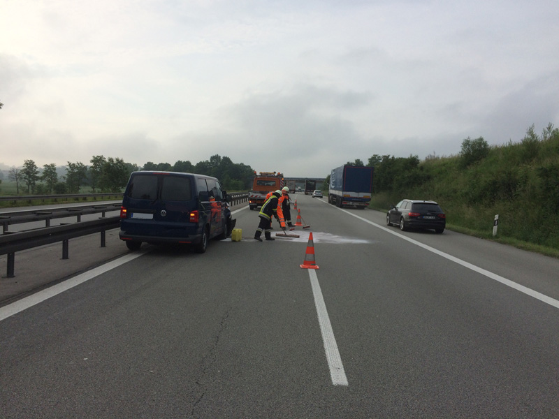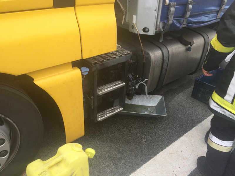 13:01 Uhr Auslaufender Kraftstoff, BAB 3, Kirchroth - Wörth Wir wurden von der Polizei angefordert, da auf der Autobahn aus einem LKW Diesel ausläuft. Bei dem LKW war die Dieselleitung abgerissen. Der ausgelaufene Kraftstoff wurde gebunden, die defekte Dieselleitung provisorisch abgedichtet.
