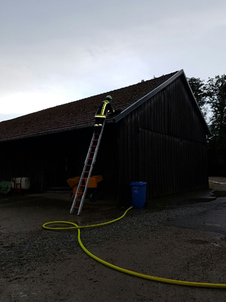 19:12 Uhr Brand nach Blitzeinschlag, Kößnach Zu einem Brand einer landwirtschaftlichen Lagerhalle wurden wir nach Kößnach alarmiert. Dort war es bei einem Gewitter zu einem Blitzeinschlag gekommen. Der Hofbesitzer hat den Entstehungsbrand selbst mit einem Gartenschlauch gelöscht und dadurch schlimmeres verhindert. Am Stadl wurde ein kleiner Bereich des Dachs ausgedeckt, um die Einschlagstelle mit der Wärmebildkamera kontrollieren zu können. Des weiteren wurde der Keller des Wohnhauses kontrolliert, da durch die Überspannung auch erheblicher Schaden an der Hauselektrik entstanden ist.