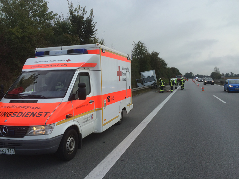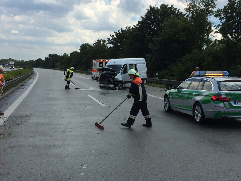 13:45 Uhr Verkehrsunfall, A3 Die Feuerwehr Kirchroth wurde zu einem Verkehrsunfall auf die A3 Richtung Steinach alarmiert. Dort war ein Sprinter in die Mittelleitplanke geschleudert und anschließend quer über 2 Fahrstreifen stehen geblieben. Alle fünf Insassen konnten sich selbst aus dem Fahrzeug befreien. Die Autobahn wurde kurzzeitig komplett gesperrt, um die Fahrbahn zu reinigen.