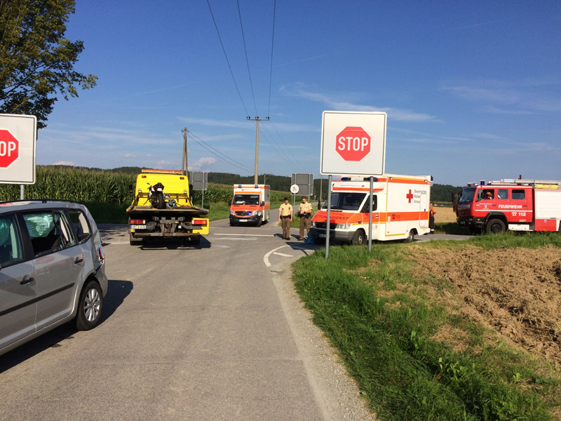 16:35 Uhr VU mit Motorrad, St2148, Kirchrother Keller Zu einem Motorradunfall wurden wir auf die Staatsstraße Richtung Saulburg im Kreuzungsbereich mit der Gemeindeverbindungsstraße von Obermiethnach nach Aufroth alarmiert. Dort hat ein Motorradfahrer einen vor ihm fahrenden PKW überholt, als dieser gerade nach links abgebogen ist. Der Motorradfahrer fuhr hinten auf, stürzte und blieb schwer verletzt auf der Fahrbahn liegen. Er wurde mit einem Rettungshubschrauber in ein Krankenhaus geflogen. Für die Zeit der Rettungsarbeiten wurde die Straße vollständig für den Verkehr gesperrt.