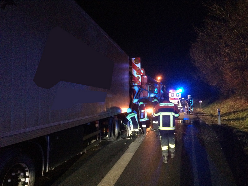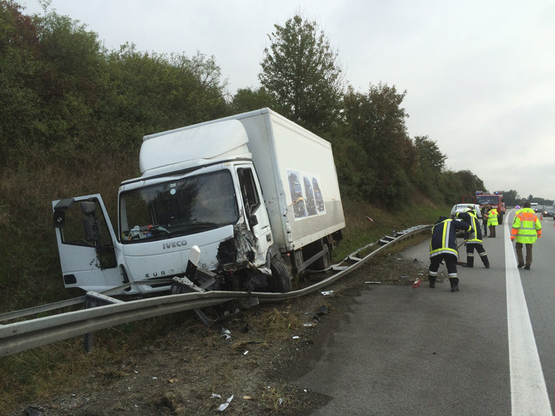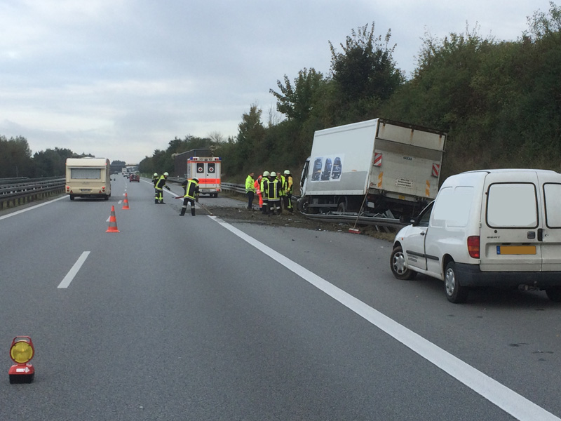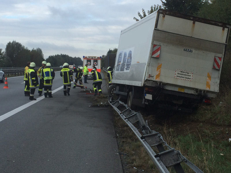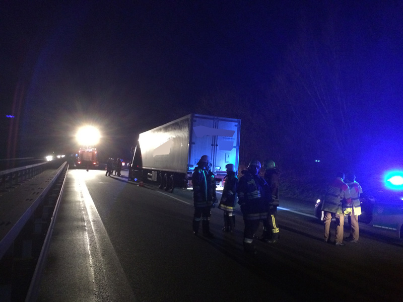 09:14 Uhr Verkehrsunfall mit LKW, A3, Kirchroth - Wörth Zu einem Verkehrsunfall mit einem LKW wurden wir auf die A3 Richtung Wörth alarmiert. Der LKW ist aus unbekannter Ursache von der Fahrbahn abgekommen und hinter der Leitplanke gelandet. Die Beiden Insassen konnten sich selbst aus dem Fahrzeug befreien und wurden vom Rettungsdienst mit leichten Verletzungen in ein Krankenhaus gebracht. Nachdem von dem Fahrzeug keine Gefahr mehr ausging, konnte die Einsatzstelle nach kurzer Zeit an die Polizei übergeben werden.