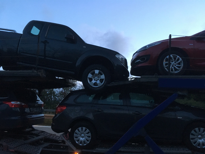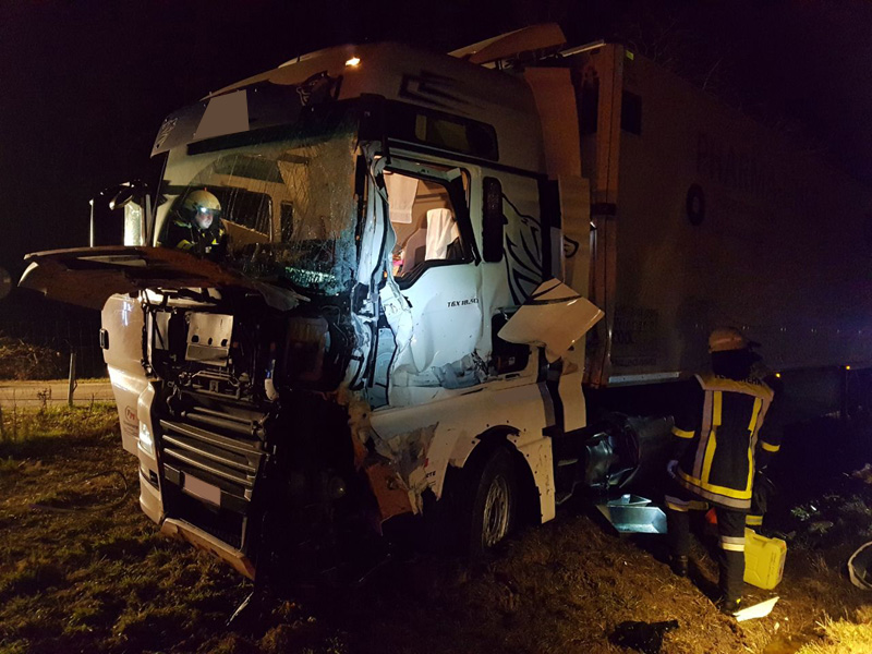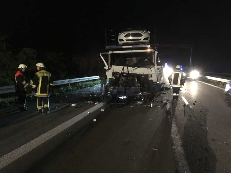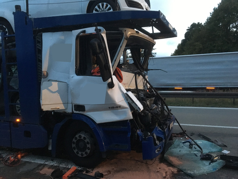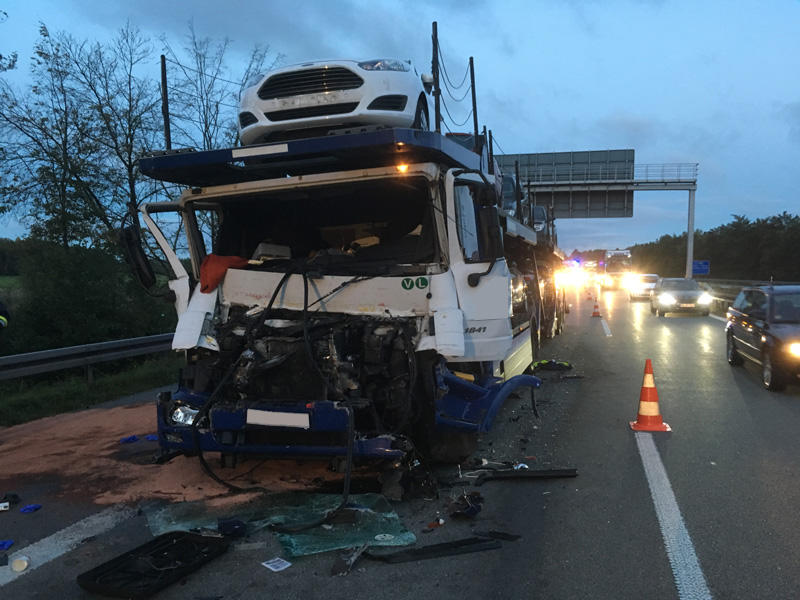 24.09.2018, Alarmierung: 05:45 Uhr VU mit LKW, A3 Kirchroth - Steinach Wir wurden zu einem Auffahrunfall zwischen zwei LKWs auf die A3 zwischen Kirchroth und Steinach alarmiert. Bei der Alarmierung war noch unklar, ob jemand eingeklemmt war oder nicht. Der Fahrer des aufgefahrenen LKWs konnte sich jedoch glücklicherweise selbst befreien und wurde nur leicht verletzt. Die Wucht des Aufpralls war so groß, dass sich die PKWs, die auf dem Autotransporter geladen waren, teils verschoben haben. Aufgabe der Feuerwehr war die Verkehrsregelung, das Ausleuchten der Einsatzstelle sowie das Binden von auslaufenden Betriebsstoffen.