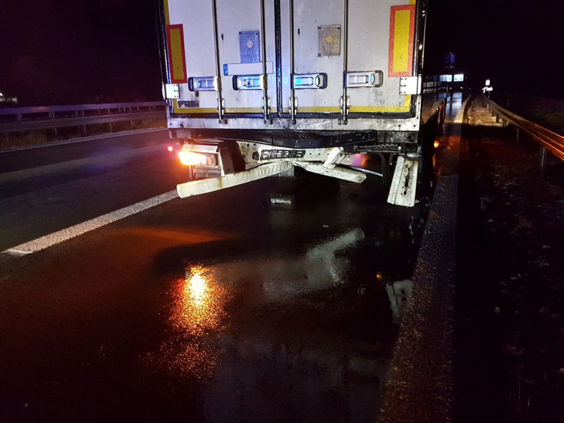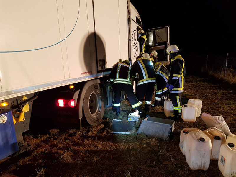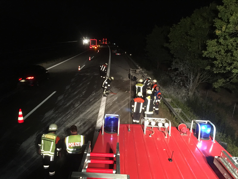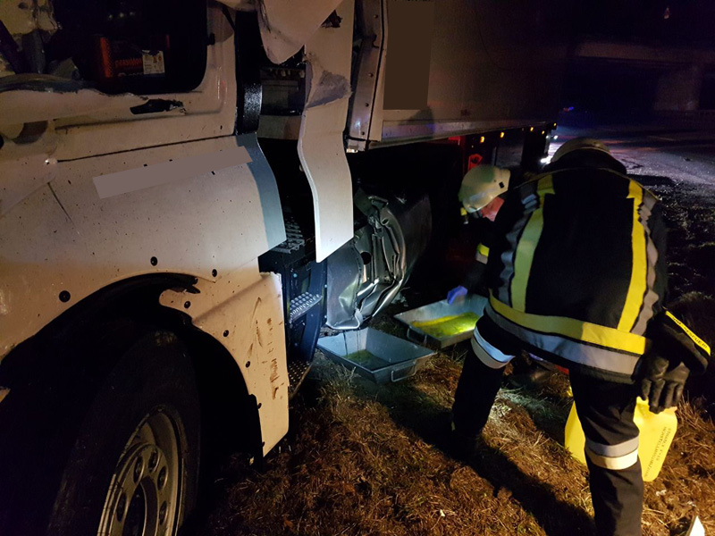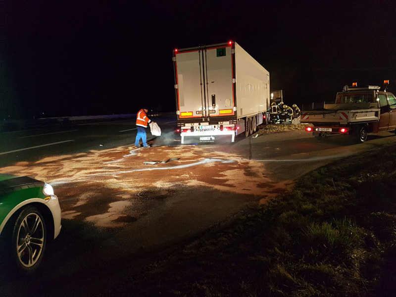 22:35 Uhr Verkehrsunfall mit LKWs, A3 Kirchroth - Wörth Die Feuerwehr Kirchroth wurde zu einem Verkehrsunfall zwischen zwei LKWs alarmiert. Ein Fahrzeug der Autobahnmeisterei wollte die Autobahn bei der Behelfsausfahrt verlassen und hat dazu die Spur gewechselt. Dabei ist es zum Zusammenstoß mit einem anderen LKW gekommen, bei dem dann der Tank aufgerissen wurde und reichlich Diesel ins Erdreich lief. Die Feuerwehr pumpte den restlichen Kraftstoff ab und band den Diesel auf der Fahrbahn.