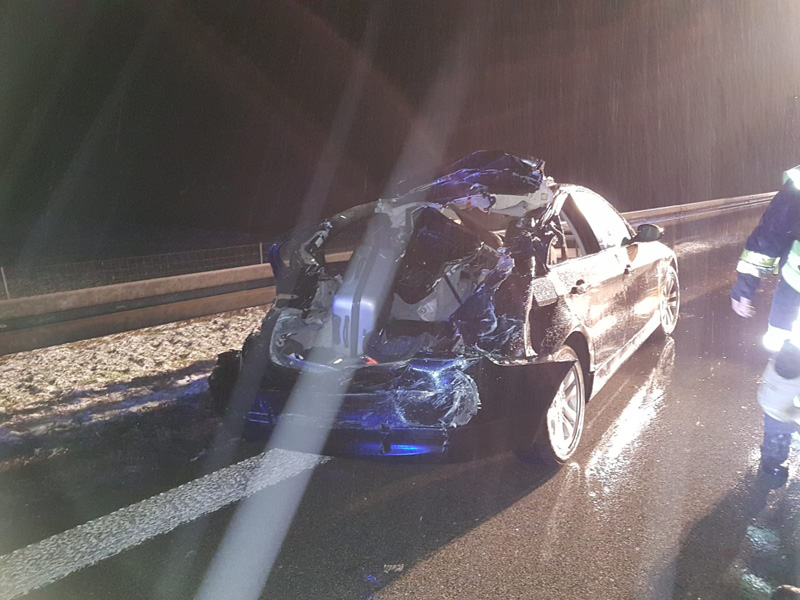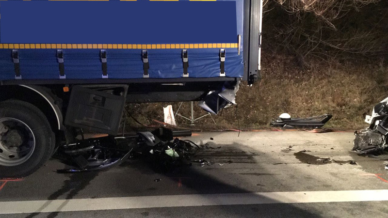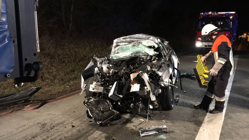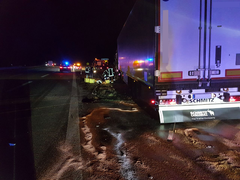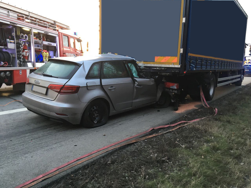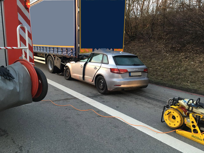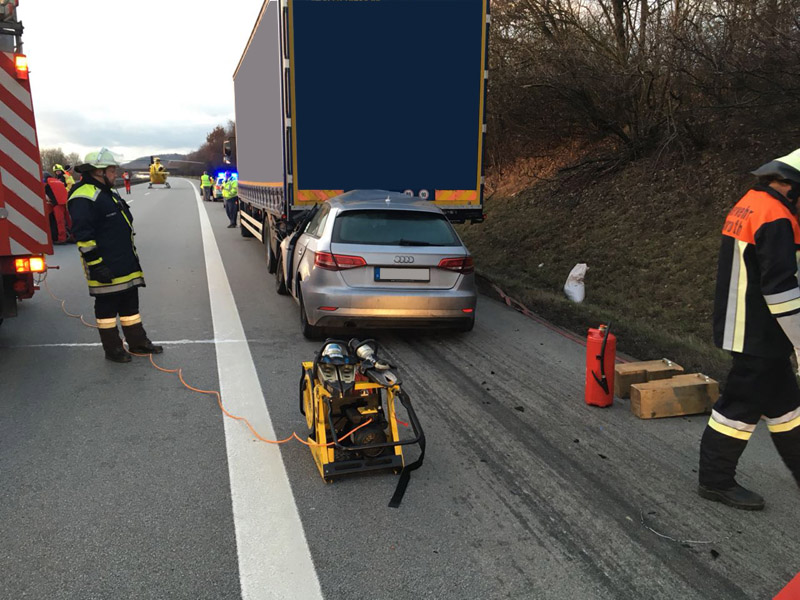 16:42 Uhr tödlicher VU, Person eingeklemmt, A3 Kirchroth - Wörth Die Feuerwehren aus Kirchroth und Parkstetten wurden zu einem Verkehrsunfall mit einer eingeklemmten Person auf die A3 alarmiert. Ein PKW war mit hoher Geschwindigkeit ins Heck eines auf dem rechten Fahrstreifen fahrenden LKWs aufgefahren. Der PKW hat sich unter den LKW gebohrt und dort verkeilt. Der Notarzt konnte nur noch den Tod des Mannes feststellen. Die Autobahn wurde für den Verkehr komplett gesperrt. Zur Ermittlung des Unfallhergangs wurde ein Unfallgutachter an die Einsatzstelle bestellt. Erst nachdem dieser mit der Spurenaufnahme fertig war, konnte der Tote aus dem Fahrzeug beborgen werden. Dazu wurde auch der Rüstwagen der FF Bogen mit seiner Seilwinde eingesetzt. Weiterhin wurde der Brandschutz sichergestellt sowie im weiteren Verlauf die Ausleuchtung der Einsatzstelle vorgenommen.
