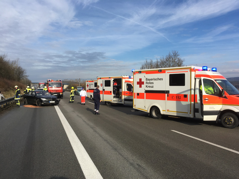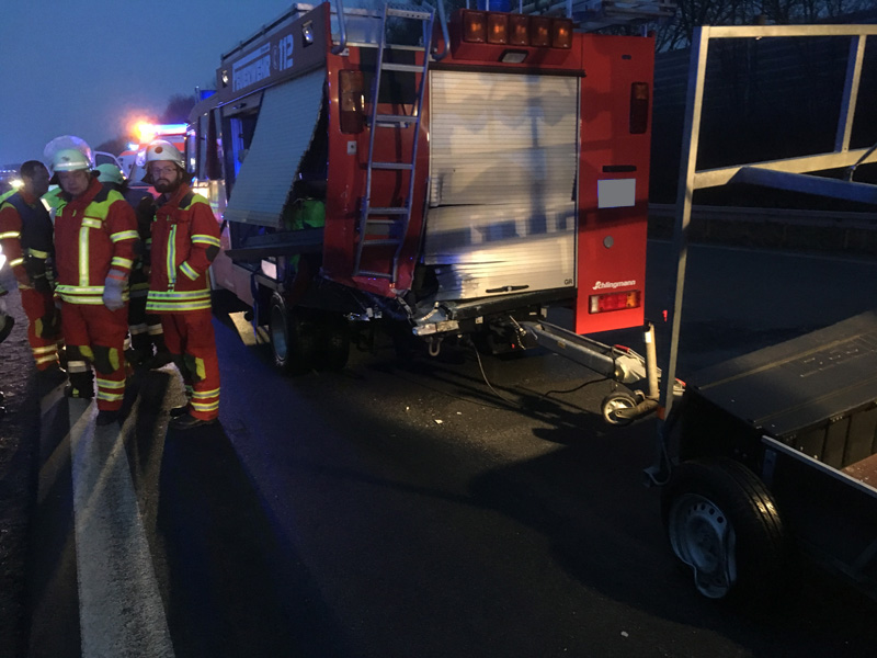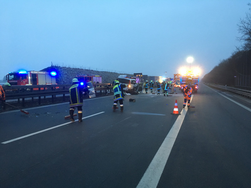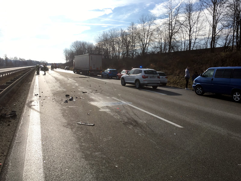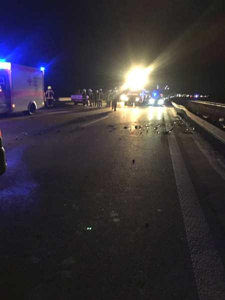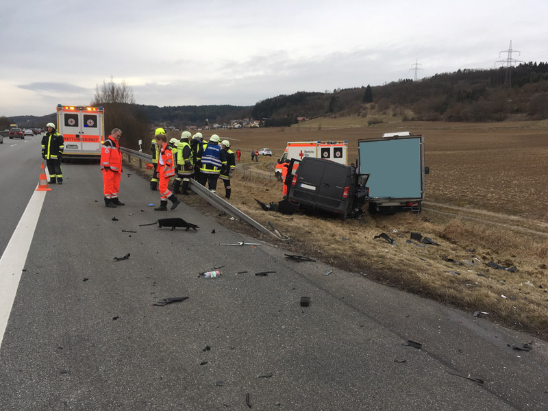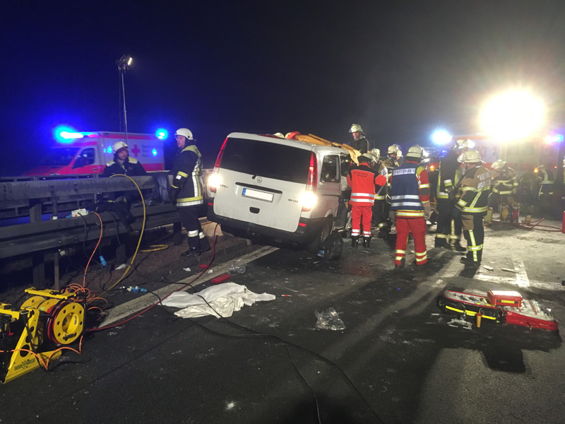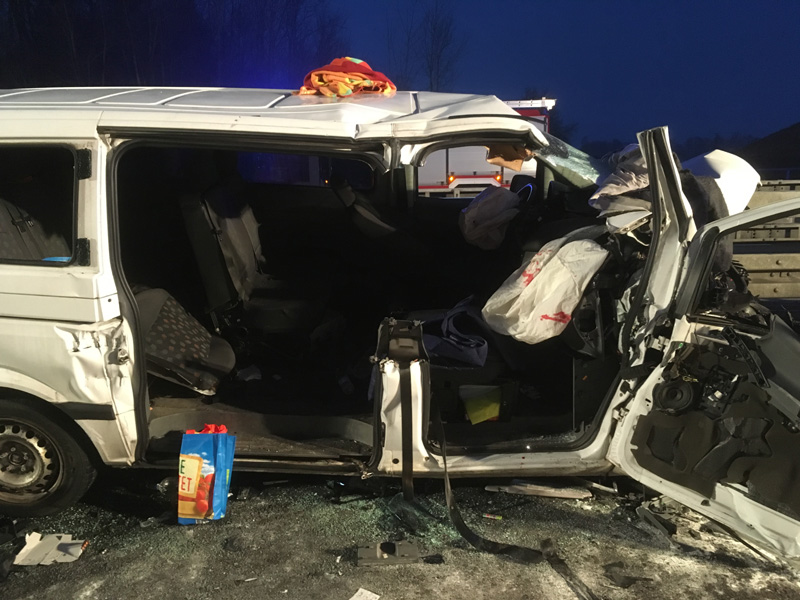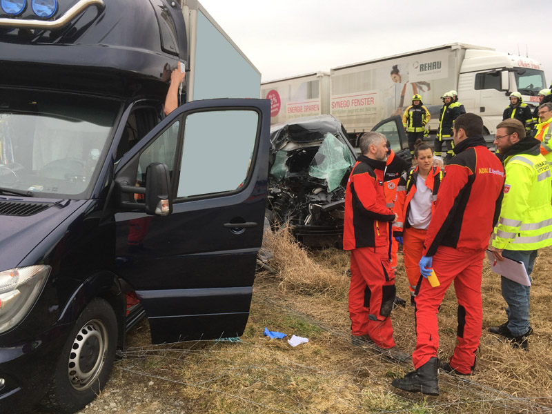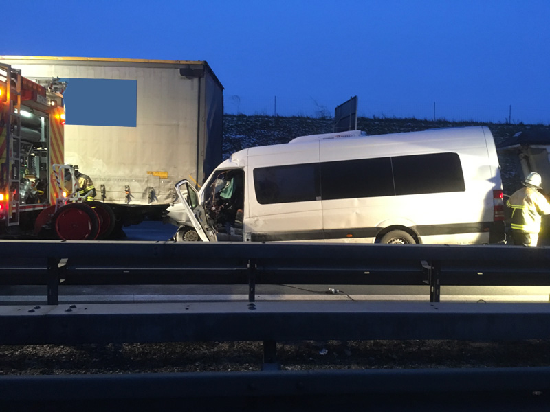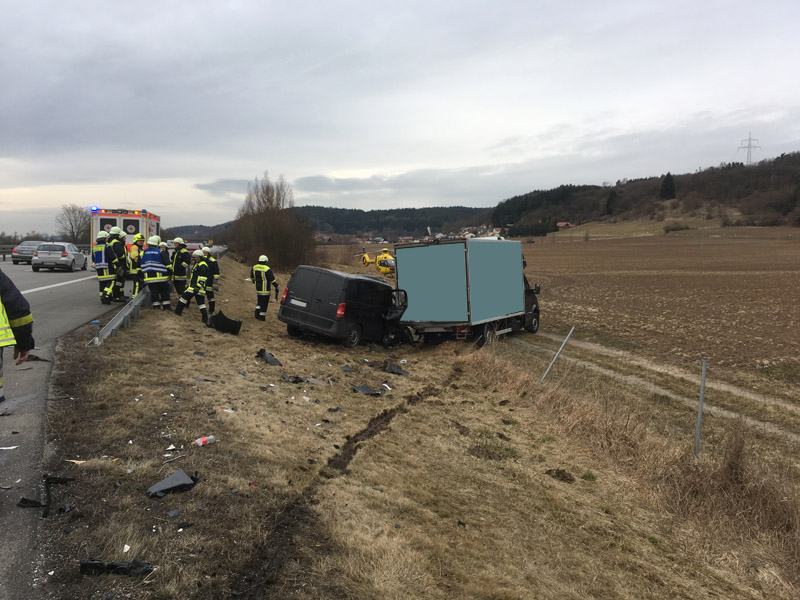 06:04 Uhr Verkehrsunfall, Person eingeklemmt, A3, Wörth - Wiesent Die Feuerwehr Kirchroth wurde zu einem Verkehrsunfall auf der A3 zwischen Wiesent und Wörth gerufen. Bei diesem Unfall war eine Person im Fahrzeug eingeklemmt, die Feuerwehr hatte jedoch aufgrund fehlender Rettungsgasse erhebliche Schwierigkeiten, die Einsatzstelle zu erreichen, daher sollten wir auf der Gegenfahrbahn die Überholspur sperren und über die Leitplanke arbeiten. Auch die Feuerwehr Pfatter hatte diesen Auftrag. Beim Einfahren der Pfatterer Wehr und dem Spurwechsel zur Überholspur ist es dann zu einem folgenschweren Unfall zwischen dem Feuerwehrfahrzeug und einem Kleinbus gekommen. Bei diesem Unfall wurden zwei der acht Insassen des Kleinbusses im Fahrzeug eingeklemmt und schwer verletzte. Unser Einsatzort hat sich somit auf den Folgeunfall verlagert. Wir unterstützen die Kameraden vor Ort bei der Personenbefreiung, der Ausleuchtung der Einsatzstelle, u. a. für die Landung des Rettungshubschraubers, der Absicherung der Einsatzstelle und der Betreuung der Verletzten, bis ausreichend Rettungsdienstmittel vor Ort waren.