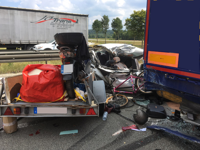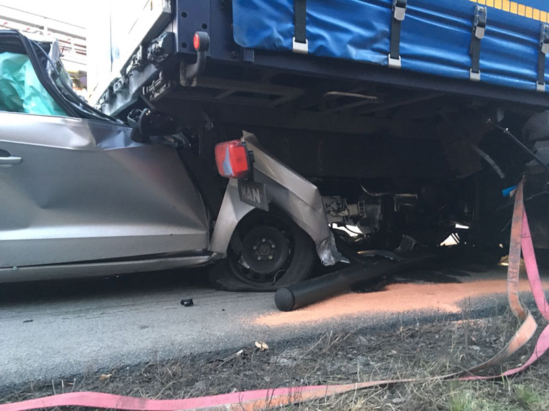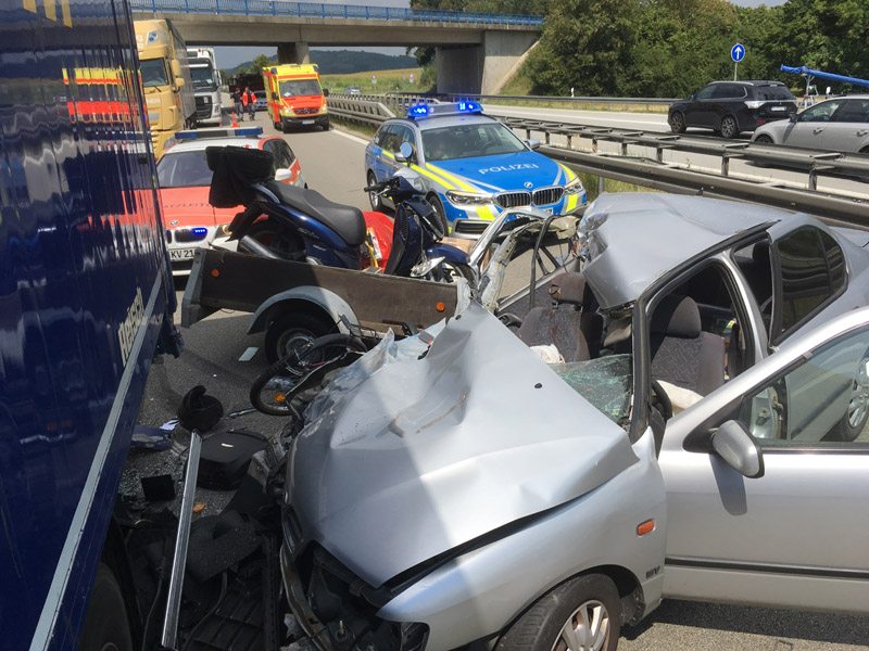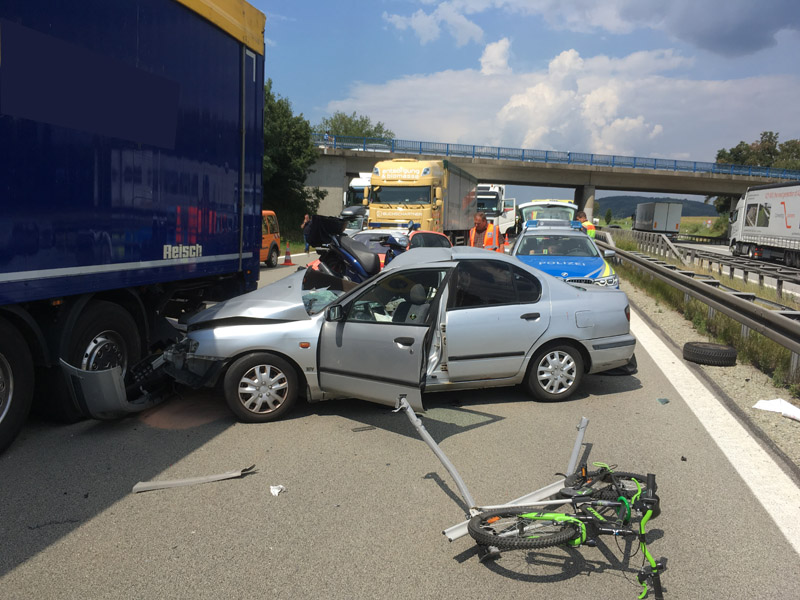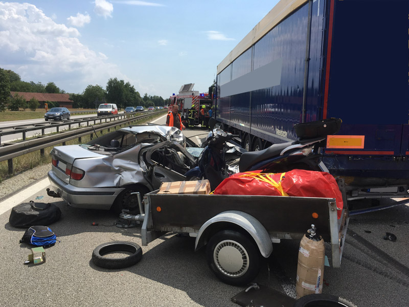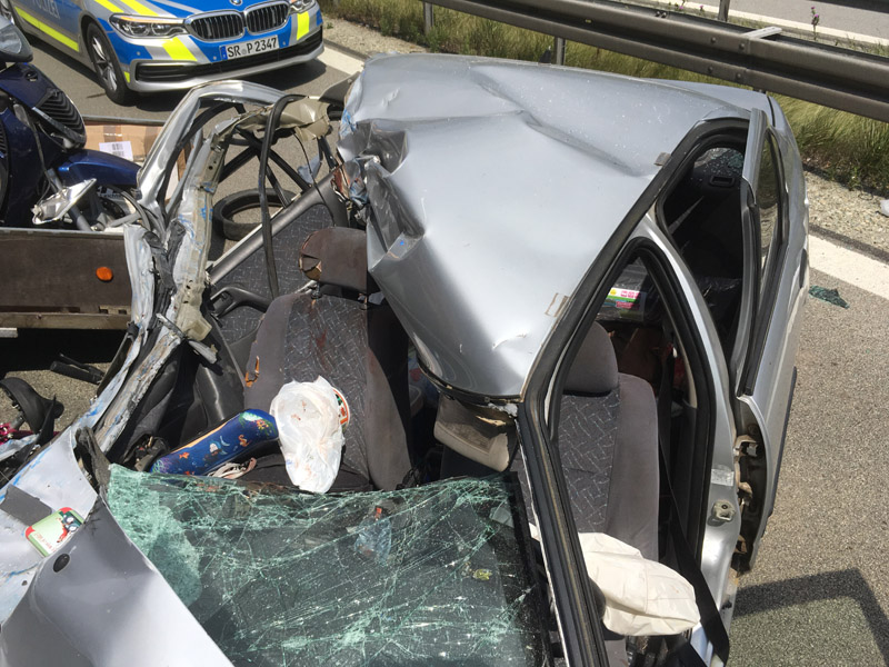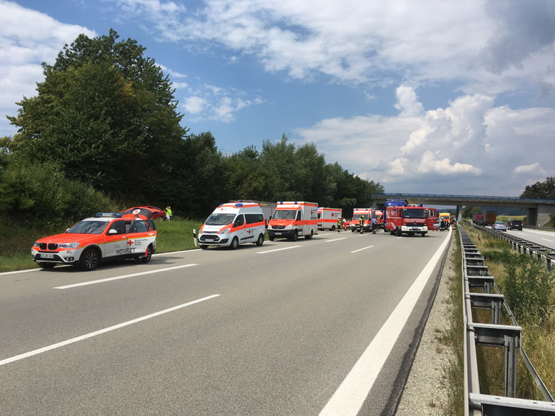 27.07.2018, Alarmierung: 11:31 Uhr VU, A3 Kirchroth - Steinach Gemeinsam mit den Feuerwehren Parkstetten und Steinach wurden wir zu einem schweren Verkehrsunfall auf die A3 Richtung Steinach alarmiert. Dort war ein PKW aus ungeklärter Ursache auf einen LKW hinten aufgefahren. Die drei Insassen, darunter ein 8 jähriges Kind, wurden bei dem Unfall schwer verletzt, waren jedoch bei unserem Eintreffen alle bereits aus dem Fahrzeug befreit. Die Verletzten wurden vom Rettungsdienst in umliegende Krankenhäuser verbracht, der LKW Fahrer erlitt einen Unfallschock. Wie wir etwa eine Woche später hören mussten, ist das Kind seinen schweren Verletzungen im Krankenhaus erlegen. Die Autobahn war mehrere Stunden für den Verkehr komplett gesperrt. Unsere Aufgabe war die Erstversorgung der Verletzten, die Verkehrsabsicherung sowie der Brandschutz an der Einsatzstelle.