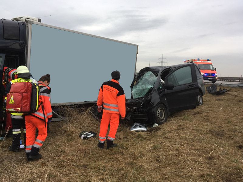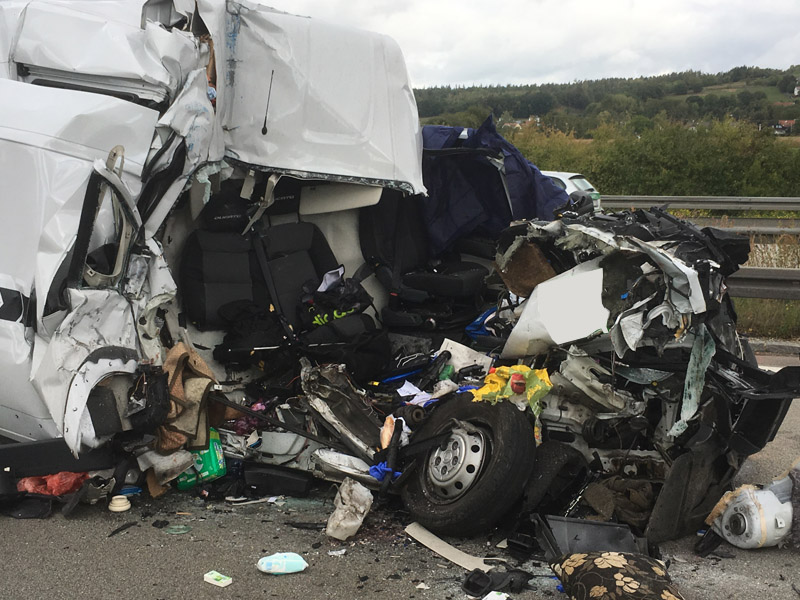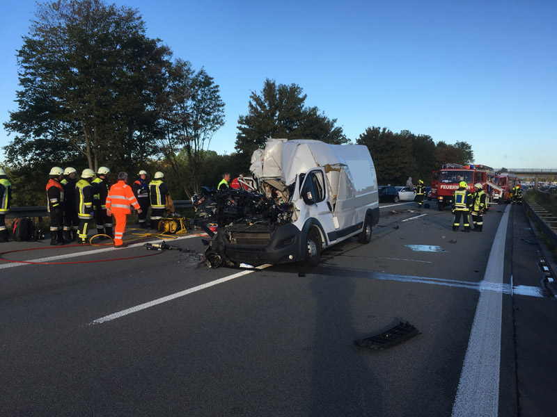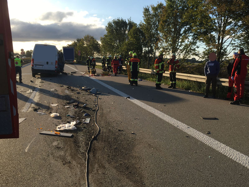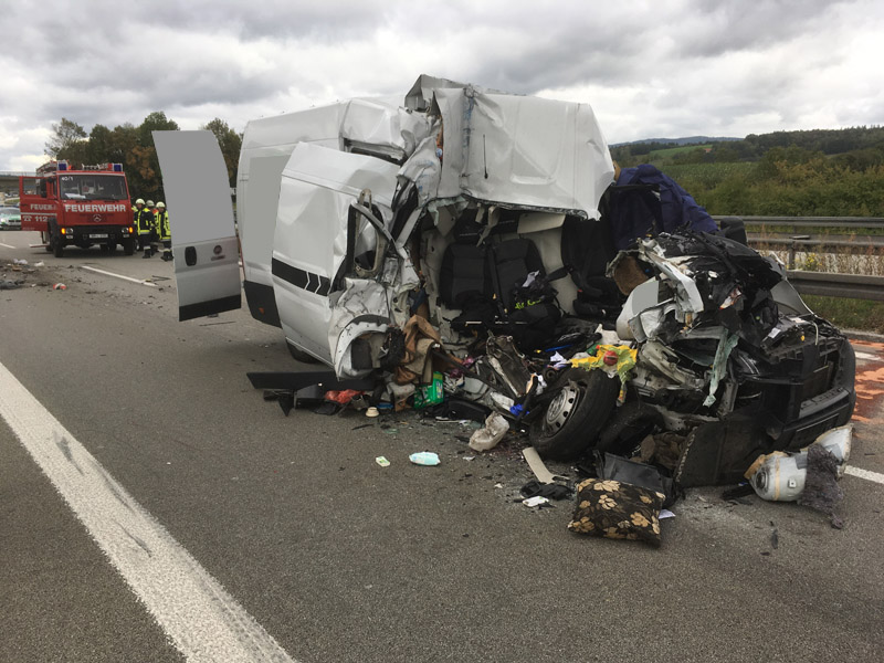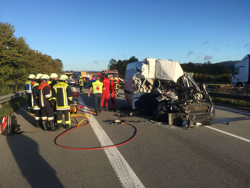 24.09.2018, Alarmierung: 07:46 Uhr tödlicher VU mit LKW, A3 Kirchroth - Steinach Nur kurze Zeit, nachdem wir vom ersten Einsatz des Tages eingerückt waren, wurde unsere Hilfe erneut angefordert. Am beginnenden Rückstau des vorhergehenden Unfalls ist ein Transporterfahrer aus unbekannter Ursache auf einen LKW aufgefahren. Der Fahrer des Transporters konnte sich noch selbst schwer verletzt aus dem Wrack befreien, für seinen Beifahrer kam jedoch jede Hilfe zu spät, er wurde bei dem Unfall schwer eingeklemmt und tödlich verletzt. Die Feuerwehr sperrte die Fahrbahn für den Verkehr, hat auslaufende Betriebsstoffe aufgenommen sowie im weiteren Verlauf, nachdem der Unfallgutachter seine Arbeit abgeschlossen hatte, den Leichnam aus dem Fahrzeug geborgen.