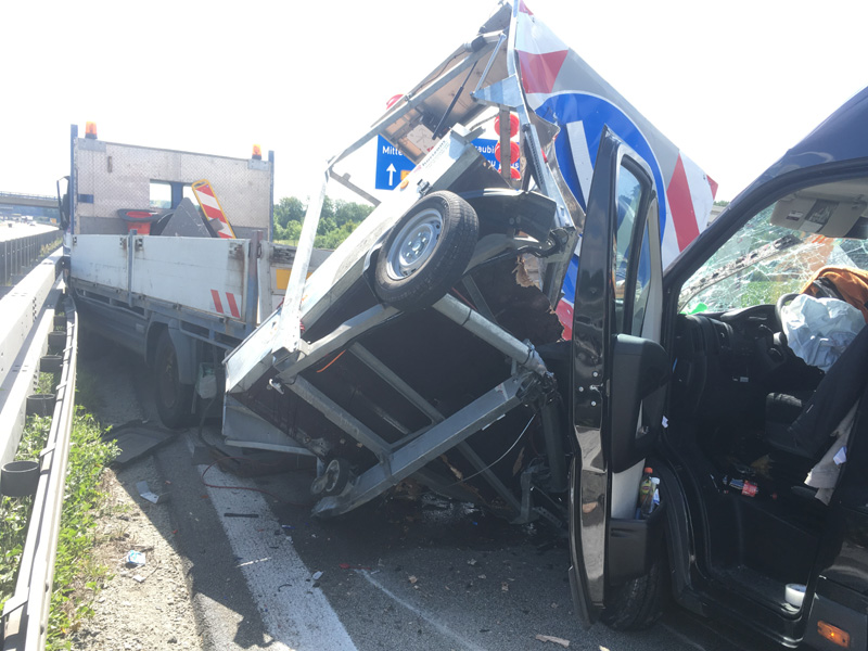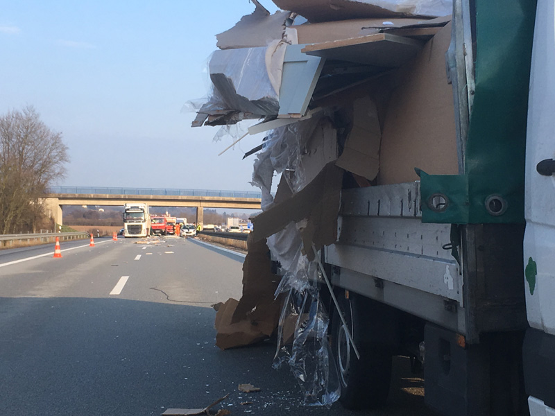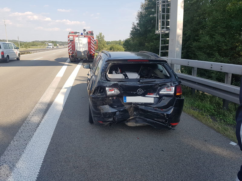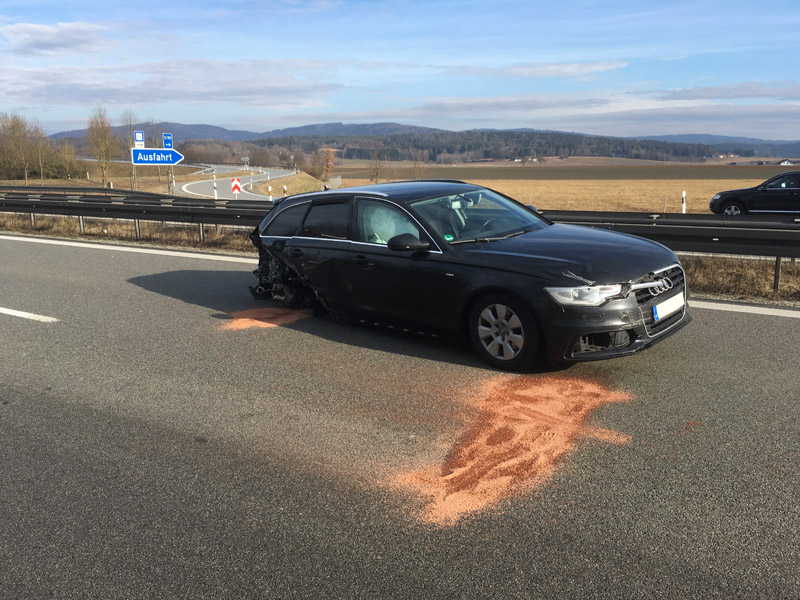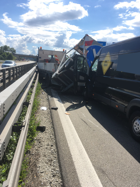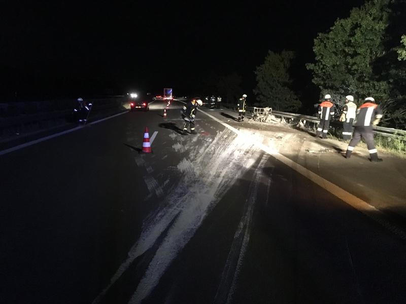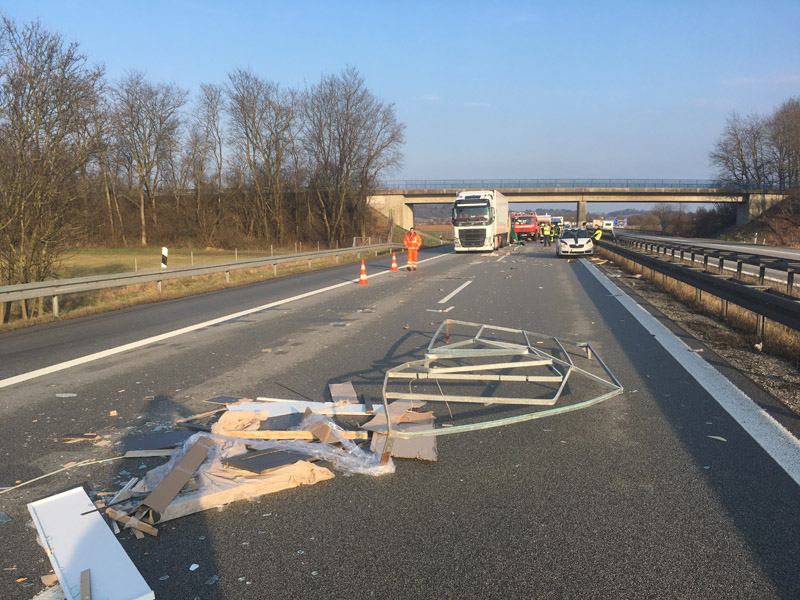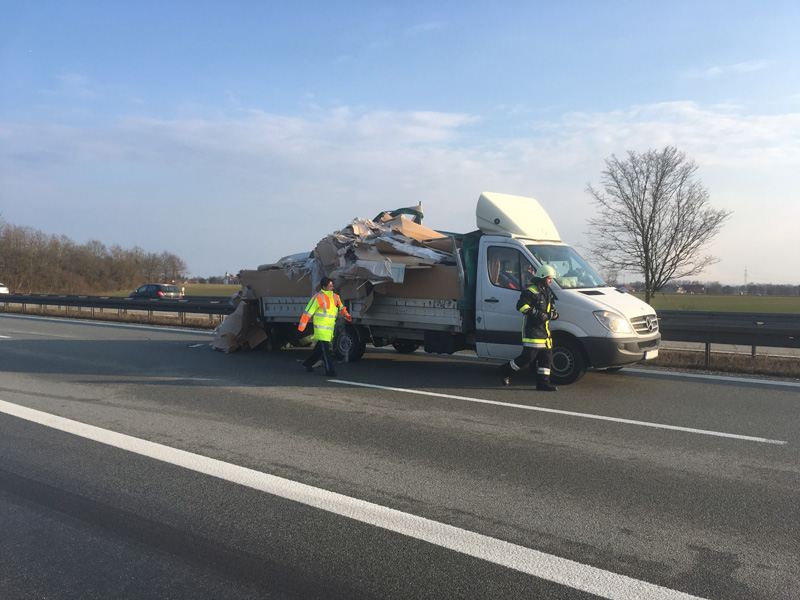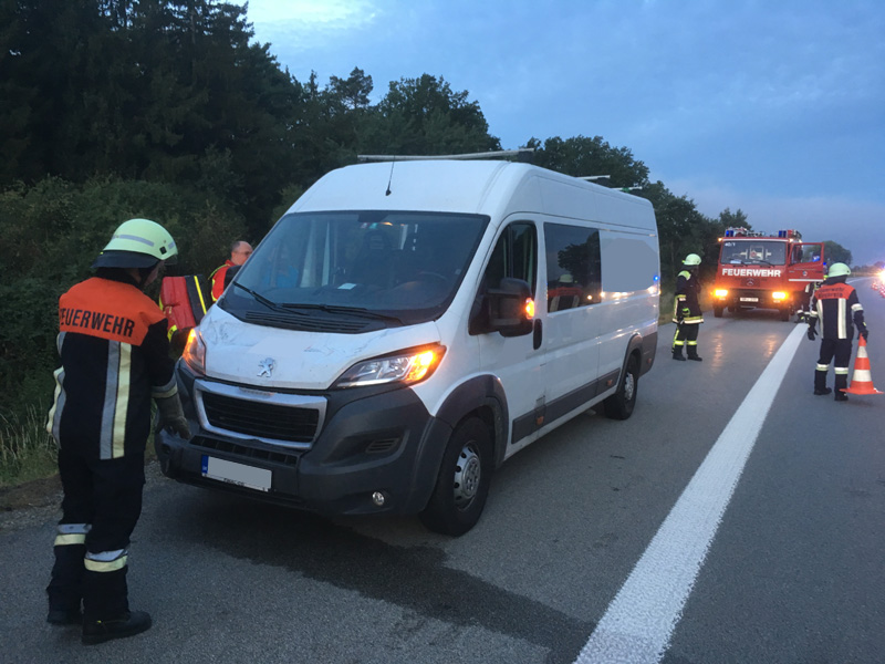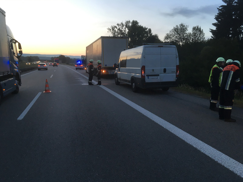 17:31 Uhr Verkehrsunfall, A3 Kirchroth - Wörth Die Feuerwehr Kirchroth wurde zu einem Verkehrsunfall am Stauende auf die A 3 gerufen. Ein Kleintransporterfahrer erkannte zu spät, dass sich der Verkehr vor ihm staute und versuchte dann noch, auf die Überholspur auszuweichen. Der Planenaufbau seines Transporters blieb jedoch noch am Eck eines Sattelschleppers hängen. Der Aufbau des Sprinters wurde dadurch heruntergerissen und ein Teil seiner Ladung verteilte sich auf der Fahrbahn. Der Verkehr wurde komplett gesperrt. Da das Unfallfahrzeug noch fahrbereit war, wurde es auf den Standstreifen gefahren. Die Überholspur wurde soweit frei gemacht, dass der Verkehr wieder freigegeben werden konnte. Zuvor wurde die Strecke noch kontrolliert, ob sich der vorhergehende Stau komplett aufgelöst hatte. Die Absperrung wurde durch die Autobahnmeisterei übernommen.