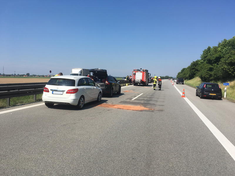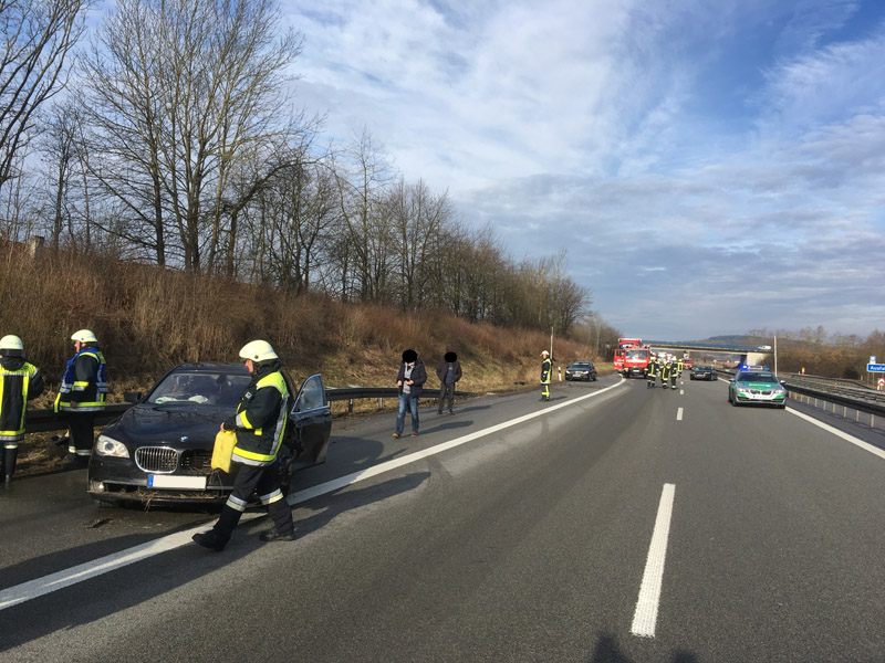 17:34 Uhr Verkehrsunfall, A3 Kirchroth - Steinach Die Feuerwehr Kirchroth wurde zu einem Auffahrunfall auf die Autobahn gerufen. Zwei Fahrzeuge waren aus unbekannten Gründen aufeinander aufgefahren. Die Einsatzstelle wurde durch die Feuerwehr abgesichert, wozu der rechte Fahrstreifen gesperrt werden musste. Des weiteren wurde die Erstversorgung der Unfallbeteiligten übernommen und die Fahrbahn gereinigt.
