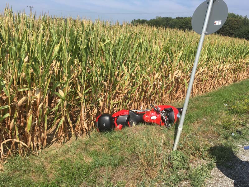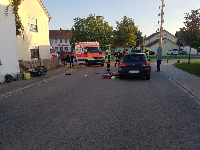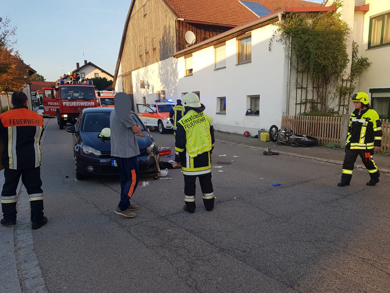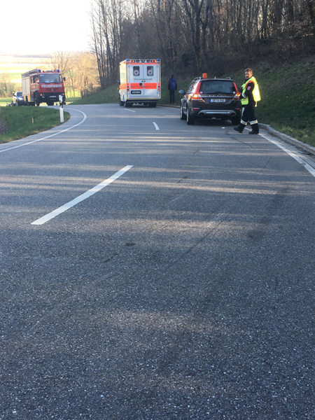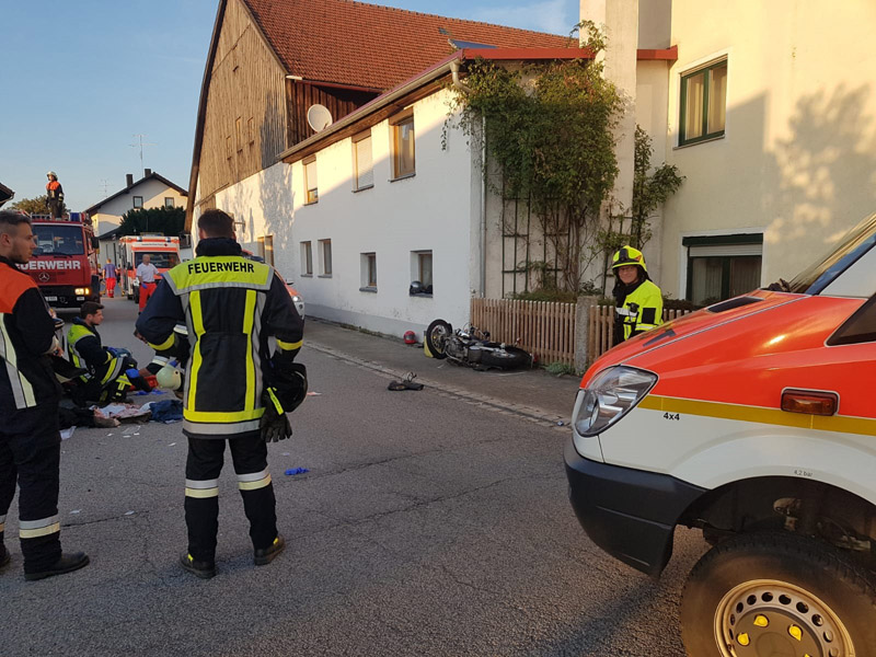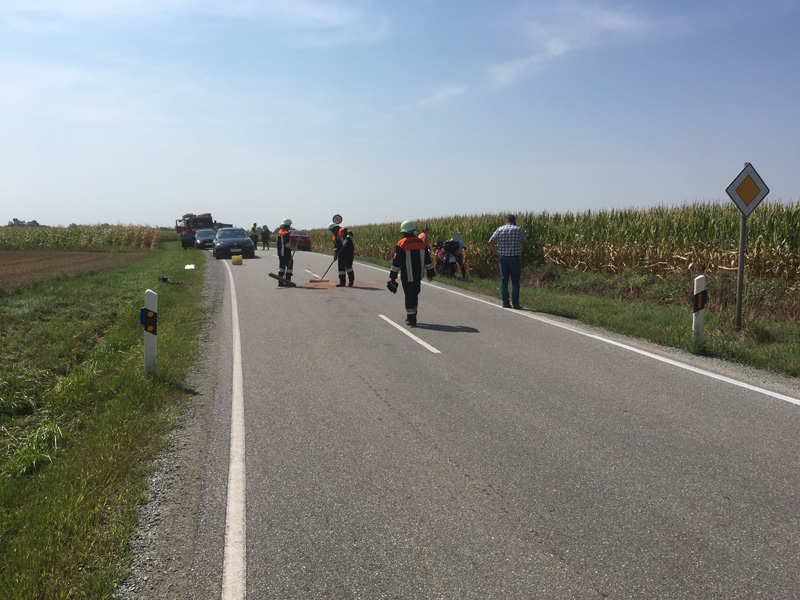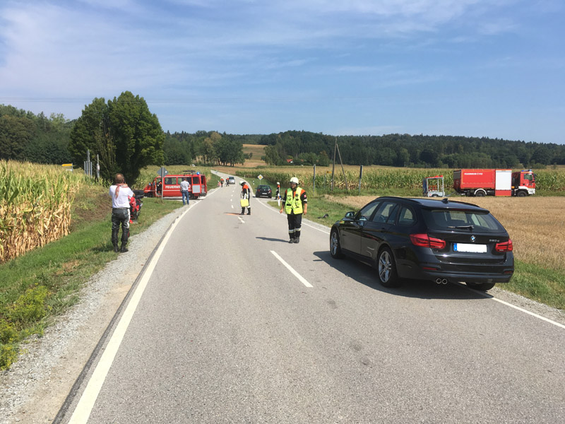 15.09.2018, Alarmierung: 18:18 Uhr VU mit Motorrad, Kirchroth, Ortsplatz Heute führte uns der Alarm zu einem Verkehrsunfall am Kirchrother Ortsplatz beim Maibaum. Dort war eine Motorradfahrerin mit Sozius mit einem entgegenkommenden PKW kollidiert. Die Motorradfahrerin wurde bei dem Unfall schwer verletzt, ihr Sozius hingegen nur leicht. Die Feuerwehr übernahm die Verkehrsregelung sowie die Reinigung der Fahrbahn.