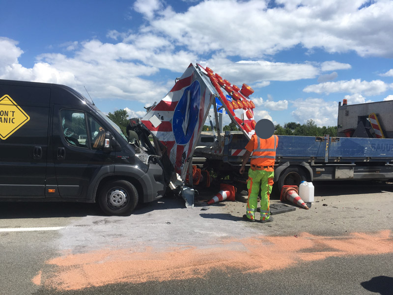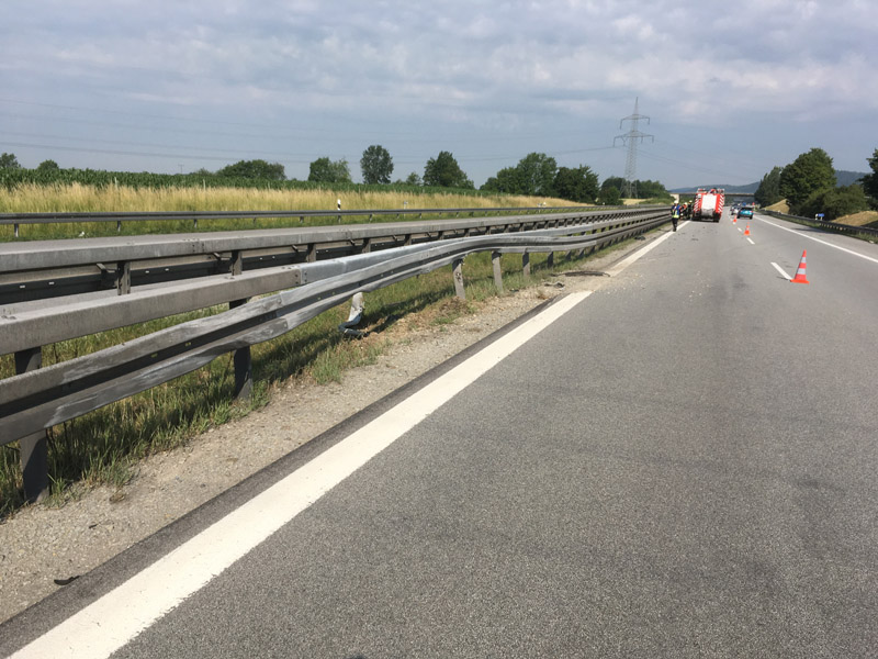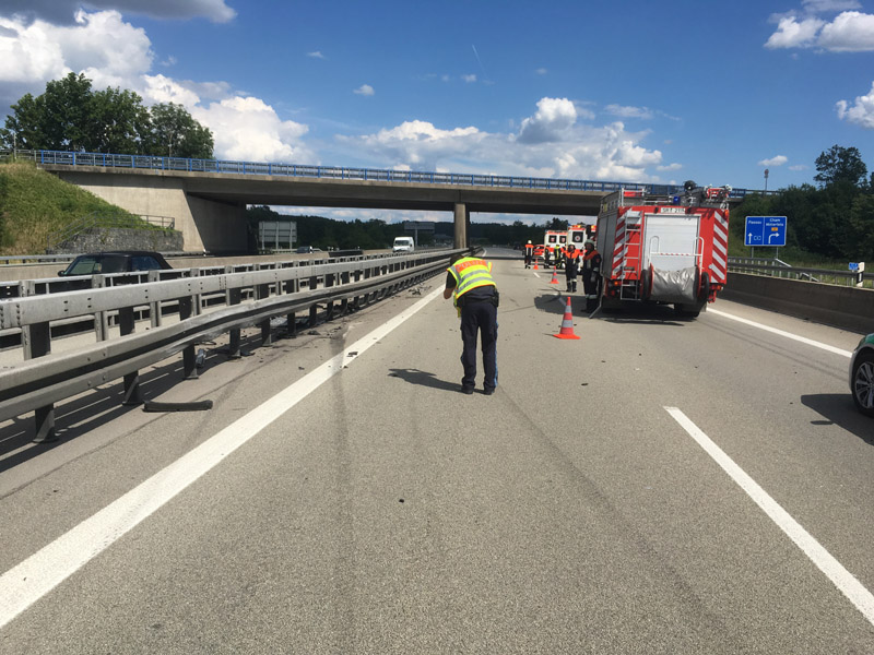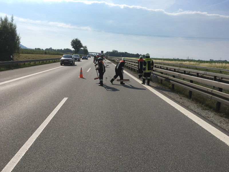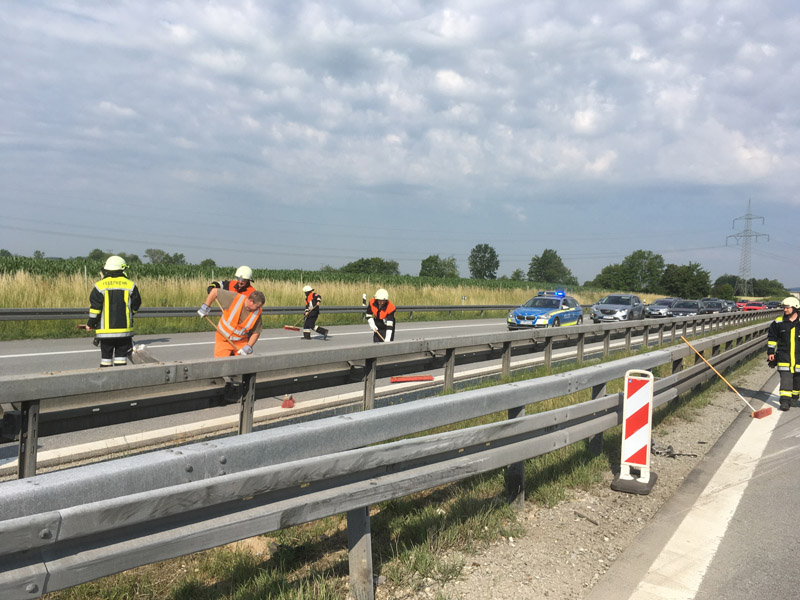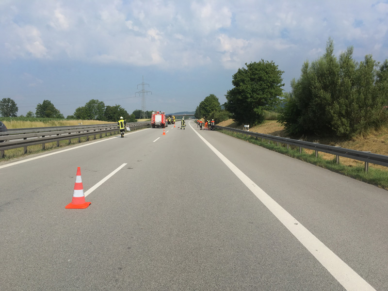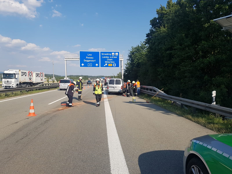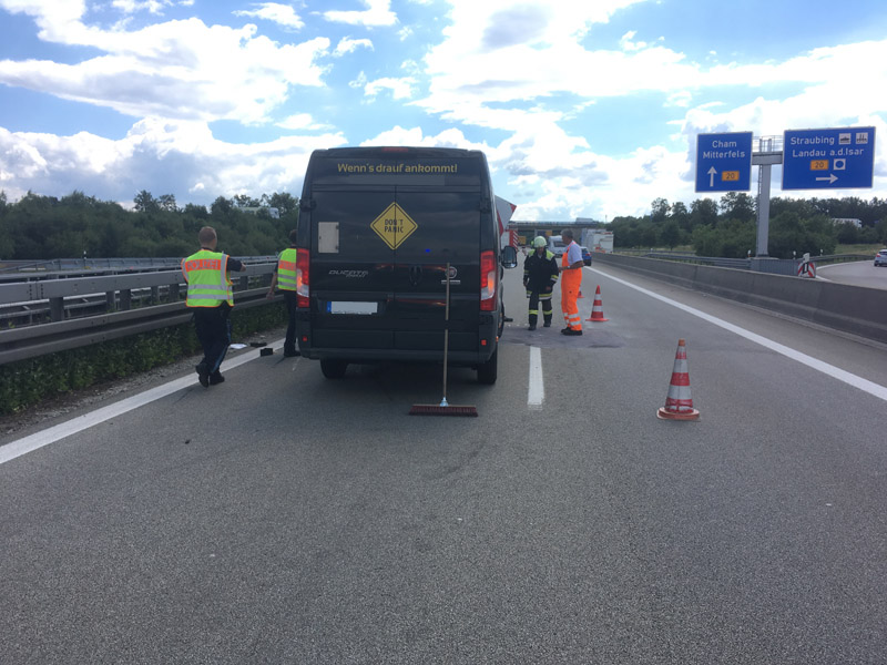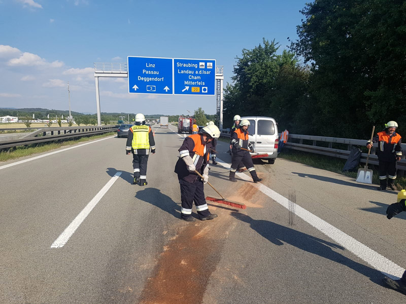 17.06.2018, Alarmierung: 08:37 Uhr Verkehrsabsicherung, A3 Kirchroth - Wörth Wir wurden von der Polizei angefordert, da sich auf der Überholspur ein Unfall ereignet hatte. Primäre Aufgabe für uns war die Absicherung der Einsatzstelle durch die Sperrung der Überholspur mit unserem VSA. Da die Autobahn zusätzlich auf der gesamten Breite verschmutzt war, wurde in Rücksprache mit der Polizei kurzzeitig eine Vollsperrung eingerichtet, damit die Fahrbahn gefahrlos gereinigt werden konnte. Durch eine weitere Streife wurde auch die Gegenfahrbahn kurzzeitig komplett gesperrt, um auch diese reinigen zu können.