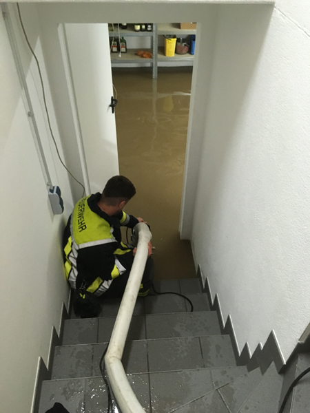 01:00 Uhr Keller unter Wasser, Kirchroth, Erlenstr. Durch das Unwetter mussten wir ein weiteres Mal zu einem Keller unter Wasser ausrücken. Das Wasser wurde mittels Tauchpumpe und Wassersauer aus dem Keller entfernt.