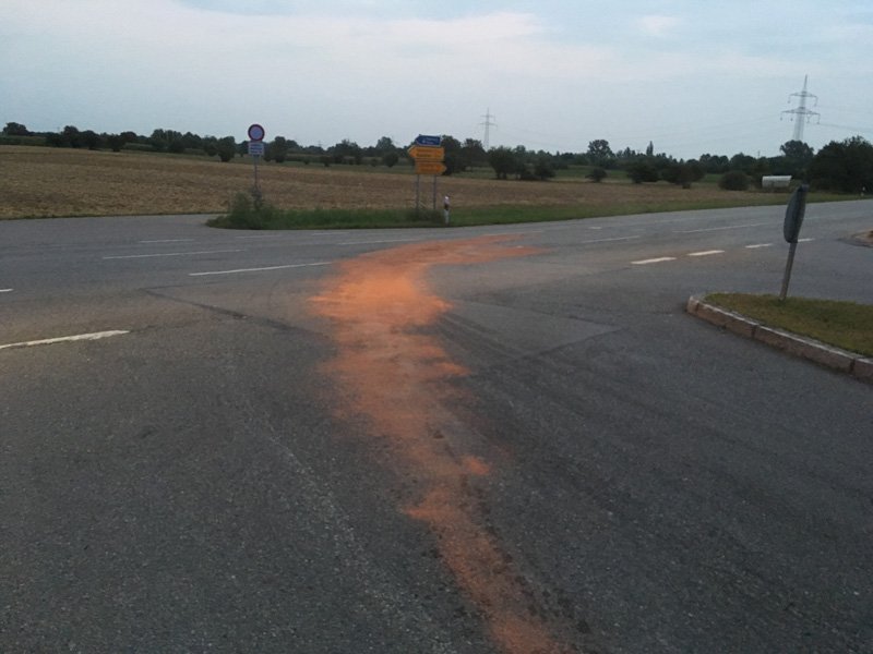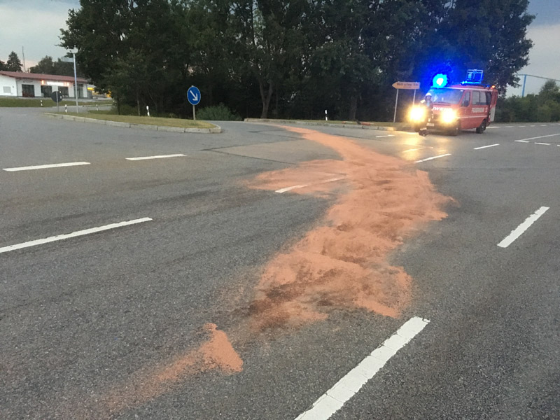 23.07.2018, Alarmierung: 21:07 Uhr Ölspur, Kirchroth Durch eine Eigenfeststellung wurden wir auf einen großen Dieselfleck auf der Staatsstraße 2125 bei der Abzweigung zur Bernauerstraße aufmerksam. Der Fleck wurde daraufhin abgestreut und die Straße gereinigt. Durch den Landkreis wurden Ölspurschilder aufgestellt. Die Strecke wurde noch weiter abgefahren und im Bereich der Otto-Hiendl-Str. konnte noch ein weiterer großer Fleck festgestellt werden, der ebenfalls beseitigt wurde, hier wurde der Bauhof Kirchroth noch wegen der Ölspurschilder hinzugezogen.