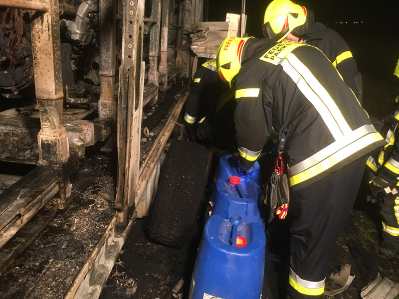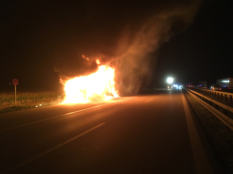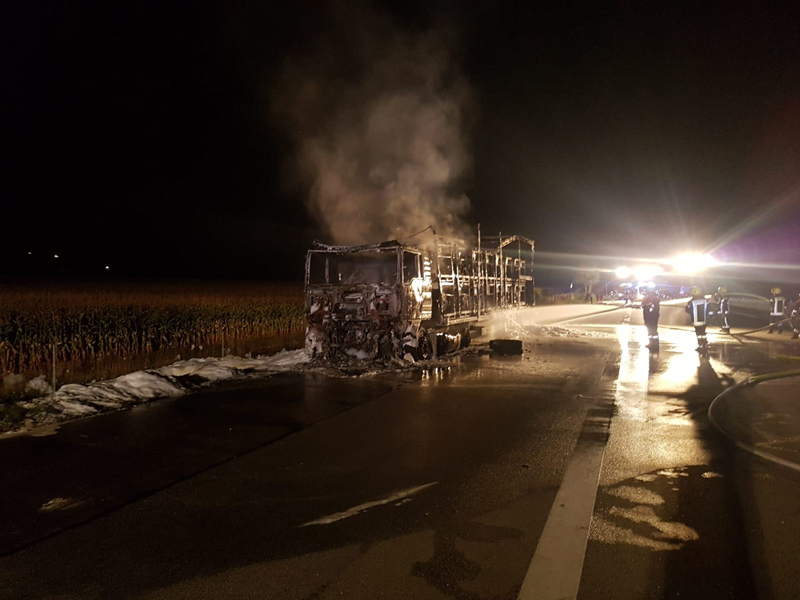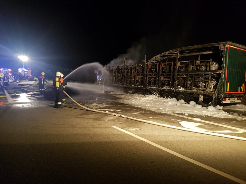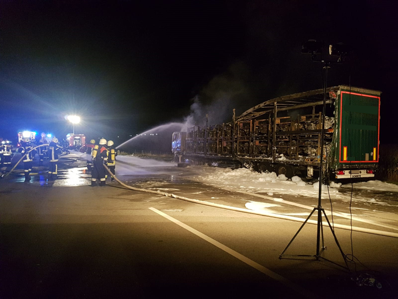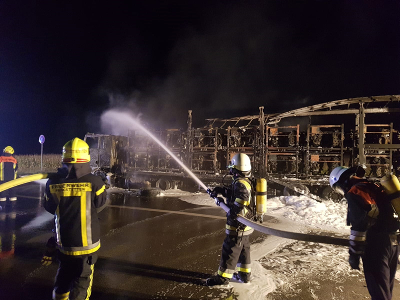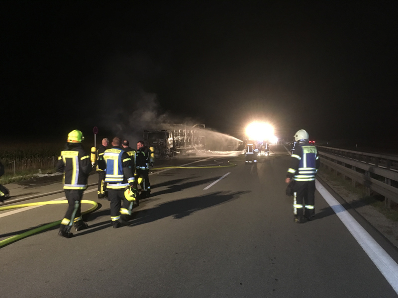 16.08.2018, Alarmierung: 21:56 Uhr LKW-Brand, A3 Kirchroth - Wörth Zu einem LKW-Brand wurden wir gemeinsam mit 4 weiteren Feuerwehren auf die A3 Richtung Regensburg alarmiert. Beim Eintreffen an der Einsatzstelle stand der LKW bereits in Vollbrand. Der Lastwagenfahrer bemerkte laut eigenen Angaben eine Fehlermeldung des Lastwagens und steuerte eine Nothaltebucht an, als er dort anhielt, fing der LKW bereits das brennen an. Der Brand wurde mit mehreren Schaumrohren bekämpft, auch ein angrenzendes Maisfeld musste geschützt werden, um ein Übergreifen zu verhindern. Da die Löschwasserversorgung auf der Autobahn recht schwierig ist, musste auch noch die Feuerwehr Straubing mit einem TLF nachgefordert werden. Zudem wurde mit mehreren Fahrzeugen ein Pendelverkehr zum Autobahnparkplatz Wellerbach hergestellt, um ausreichend Wasser an die Einsatzstelle zu bringen. Der LKW, der mit Motorblöcken beladen war, ist vollständig ausgebrannt. Die Feuerwehr kümmerte sich, neben der Brandbekämpfung, auch noch um die Verkehrsabsicherung, die Ausleuchtung der Einsatzstelle sowie um das Abpumpen des restlichen Kraftstoffs. Der THW Fachberater wurde ebenfalls zur Einsatzstelle beordert, jedoch wurde im Verlauf klar, dass das THW hier nicht weiter eingreifen muss.